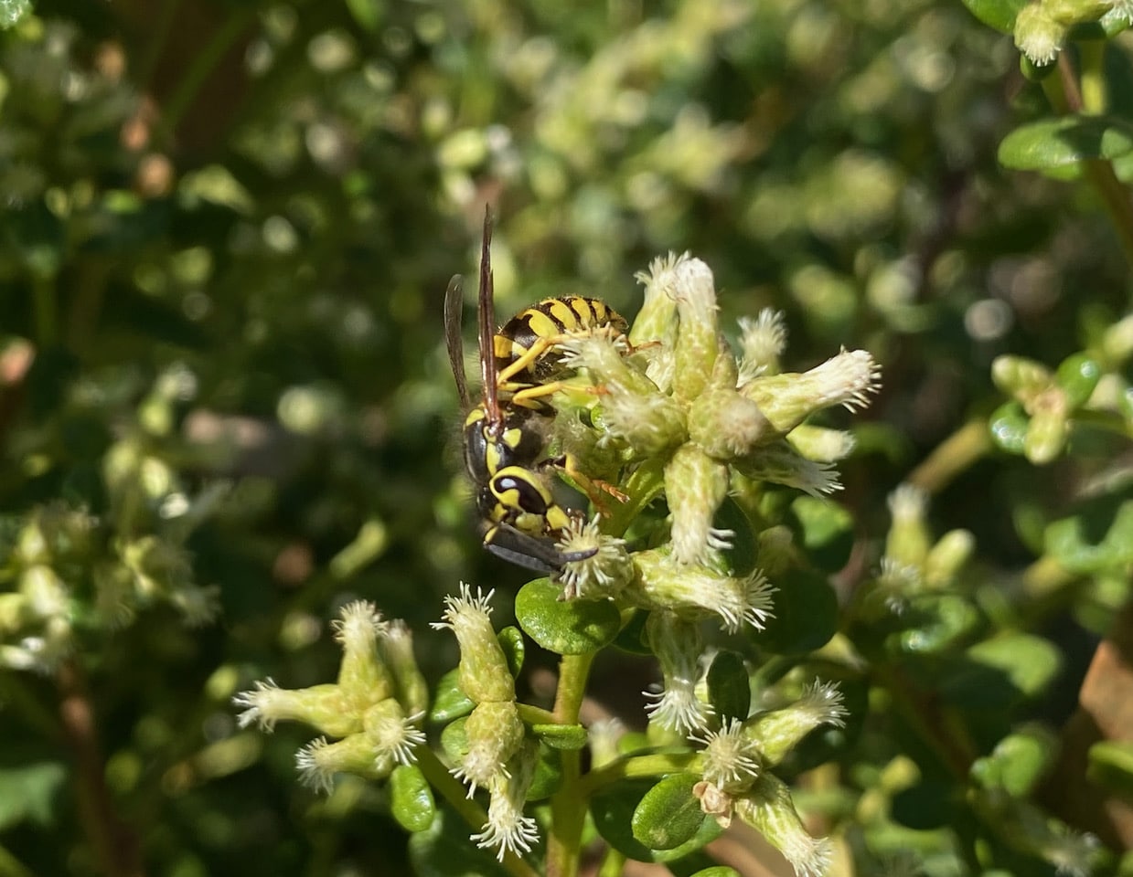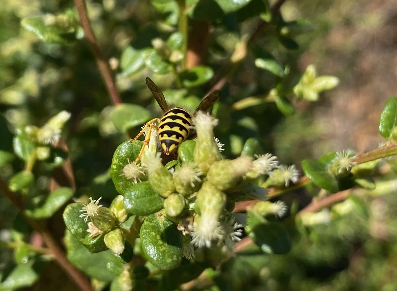 A large Yellowjacket is foraging among the flowers of a female Coyote Brush, Baccharis pilularis. Like the other colonial Hymenoptera, the Honey Bees, these wasps persist through the seasons well, thanks to their social organization.