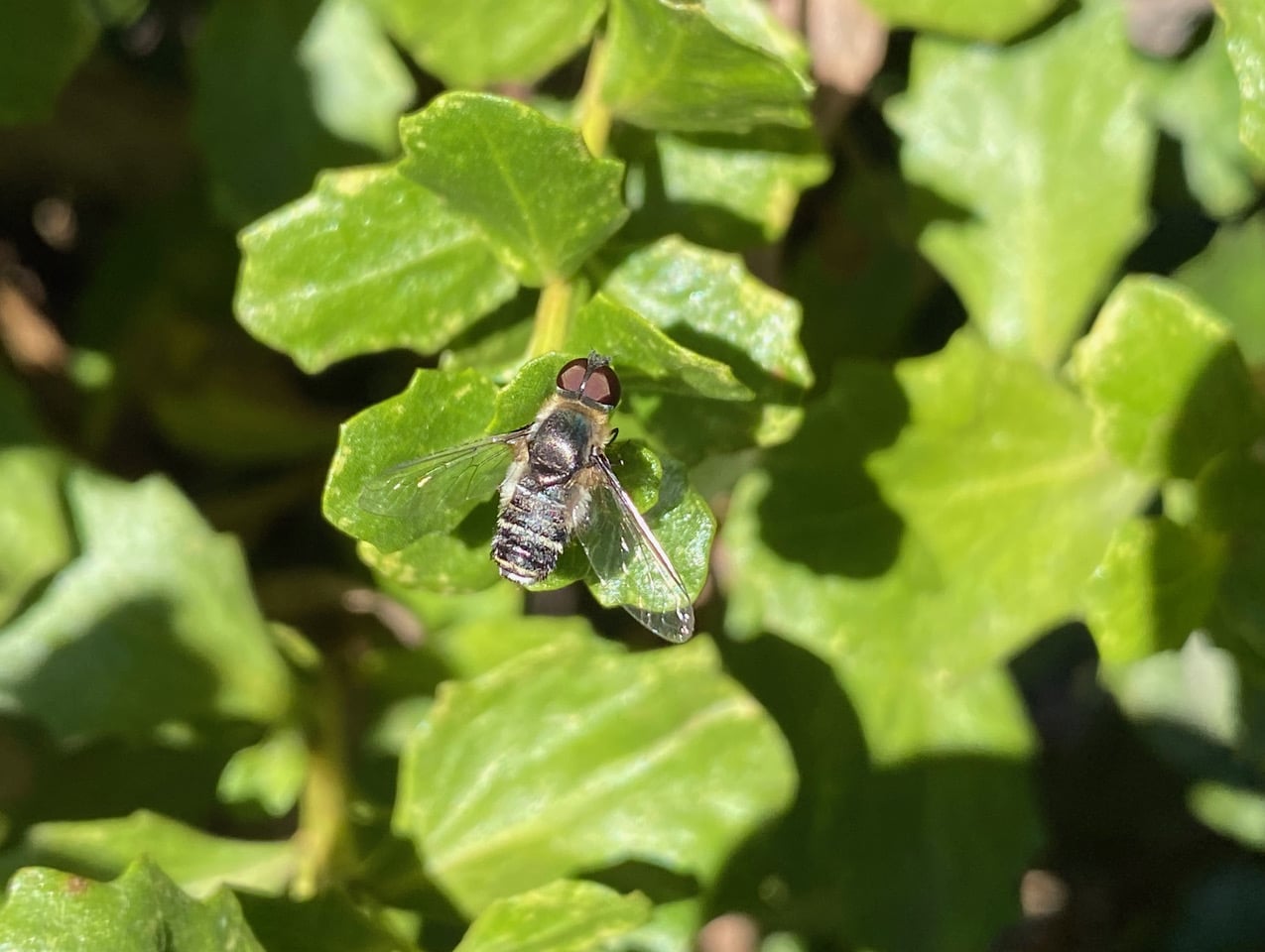 A Bee Fly, Villa lateralis (family Bombyliidae) has landed on a leaf of Coyote Brush. The Bee Flies belong to the family Bombyliidae. Adults generally visit flowers for nectar and pollen, some being important pollinators. Larvae generally are parasitoids of other insects. When at rest, many species of bee flies hold their wings at a characteristic “swept back” angle. The adult females usually deposit eggs in the vicinity of possible hosts, quite often in the burrows of beetles or ground-nesting bees/wasps. Bombyliidae parasitism is not host-specific, but rather opportunistic, using a variety of hosts. Adult females of the genus Villa lay eggs in mid-air and flick them towards the nest entrances of their hosts. They typically have an eversible pouch near the tip of their abdomen known as a sand chamber, which is filled with sand grains gathered before egg laying. These sand grains are used to coat each egg just before their aerial release, presumably to improve the female’s aim by adding weight.