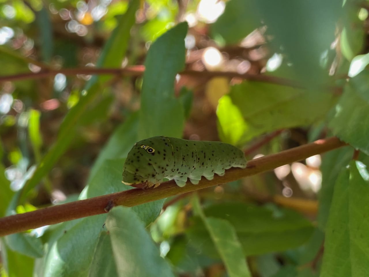 I stop by Inspiration Point to check on the little Pale Swallowtail caterpillar that I discovered a few days ago. Its Coffeeberry host plant is only a short walk from the gate. From the Nimitz Trail, the caterpillar still looks like bird poop, mostly brown and white. But on closer inspection, I see that it has acquired a blue cast over its skin, the color seeming to be spreading upward from its underside. The caterpillar is growing up nicely!