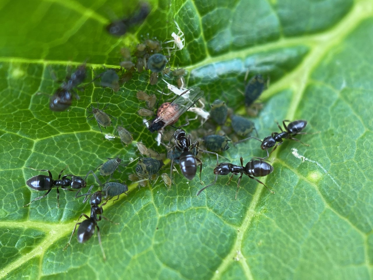 Ants and aphids share a well-known mutualistic relationship. The aphids produce honeydew, a sugary food for the ants; in exchange, the ants care for and protect the aphids from predators and parasites. Some ants will “milk” the aphids to make them excrete the sugary substance. The ants stroke the aphids with their antennae, stimulating them to release the honeydew. Aphid-herding ants make sure the aphids are well-fed and safe. When the host plant is depleted of nutrients, the ants carry their aphids to a new food source. If predatory insects or parasites attempt to harm the aphids, the ants will defend them aggressively. Some species of ants continue to care for aphids during winter. The ants carry the aphids to their nest for the winter months, and transport them to a host plant to feed the following spring.