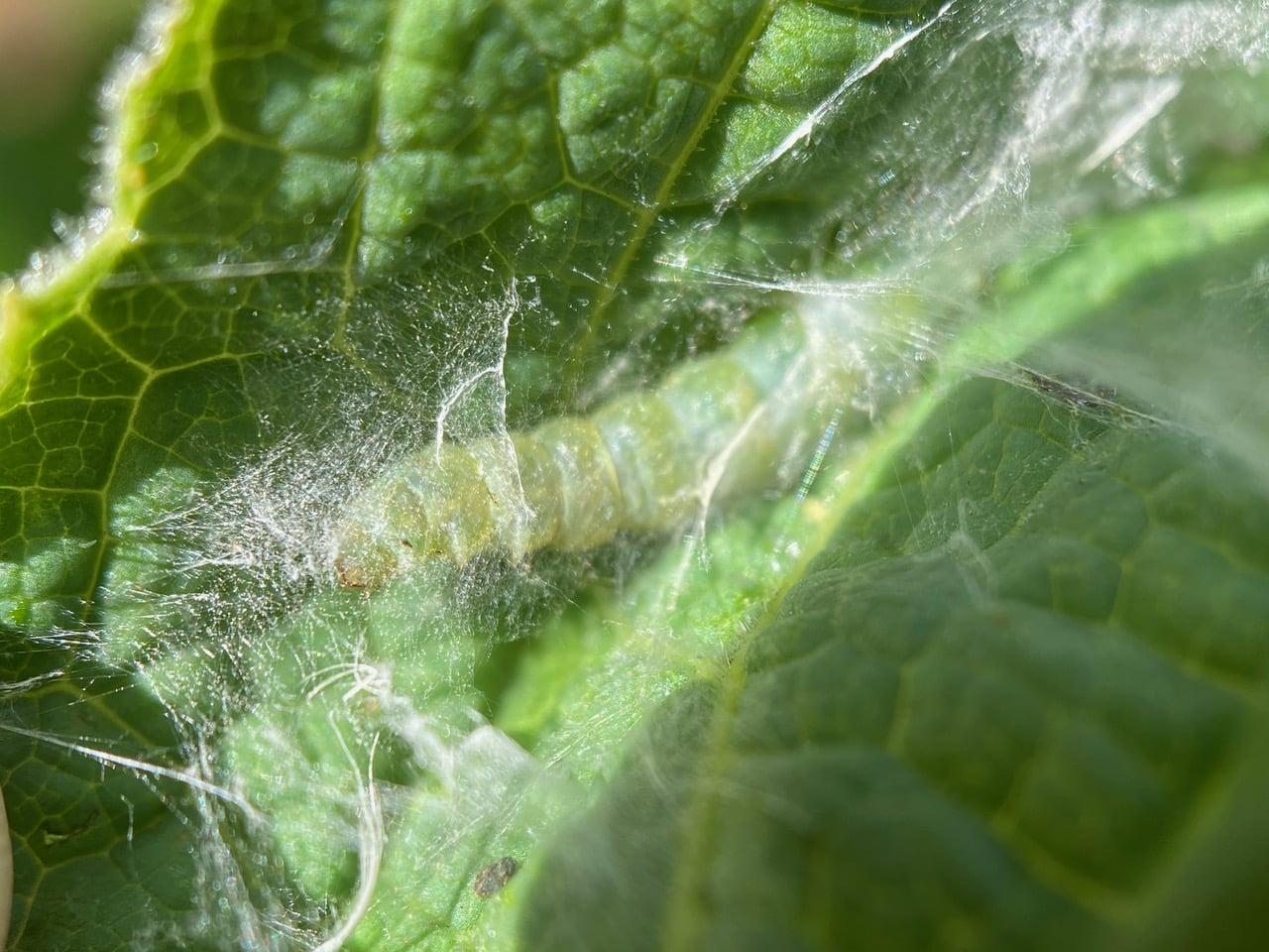 Curious, I gently pull apart the fold. The silk gives way easily, revealing a green caterpillar inside. I regret my action as soon as I see the insect. The construction of the retreat must’ve been a major undertaking for the little caterpillar. I hope it can repair or rebuild its shelter. The caterpillar is probably a member of the family Tortricidae, commonly known as tortrix moths or leafroller moths. Leaf shelter-builders, either leaf-tiers or leaf-rollers, use silk to help create protective shelters. The caterpillars attach silk to both sides of a leaf. When the elastic silk draws tight, the surfaces are pulled together. The shelter hides the caterpillars from predators and creates a safe haven for feeding in peace.