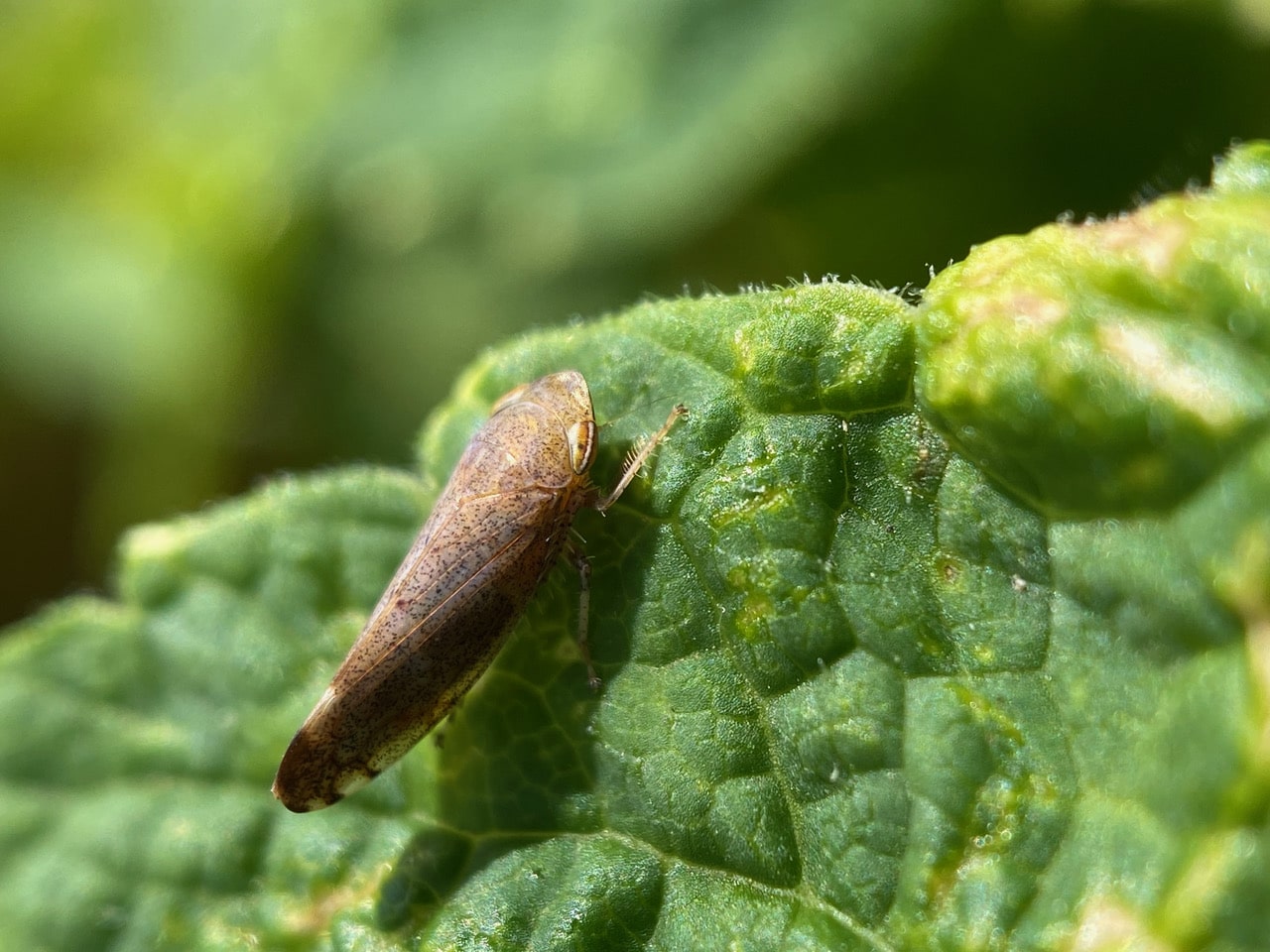 Looking every bit like plant debris, a Privet Leafhopper, Fieberiella florii (family Cicadellidae) is resting stock still on a leaf of Cow Parsnip, Heracleum maximum.