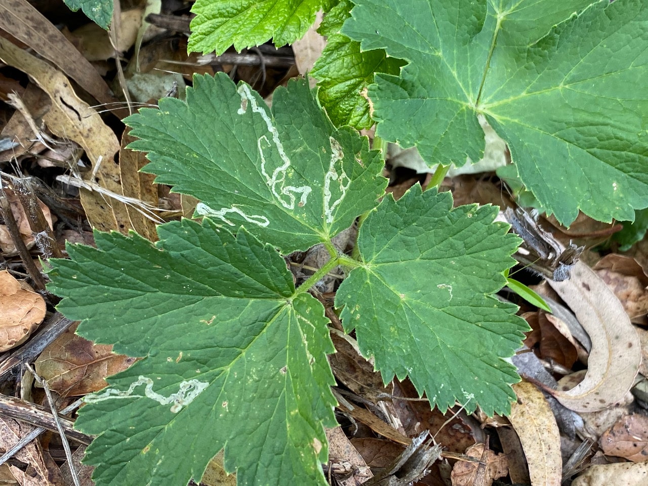 Who made those squiggle lines on the leaf of Cow Parsnip, Heracleum maximum? The culprits are most likely the Cow Parsnip Leaf Miner, Phytomyza sp. (family Agromyzidae).