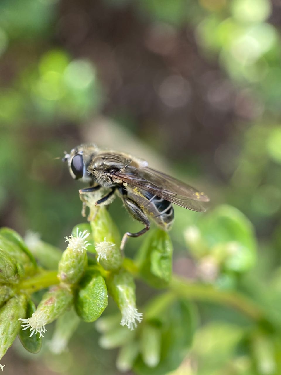 A Common Sickleleg, Asemosyrphus polygrammus (family Syrphidae) visits a Coyote Brush in bloom.