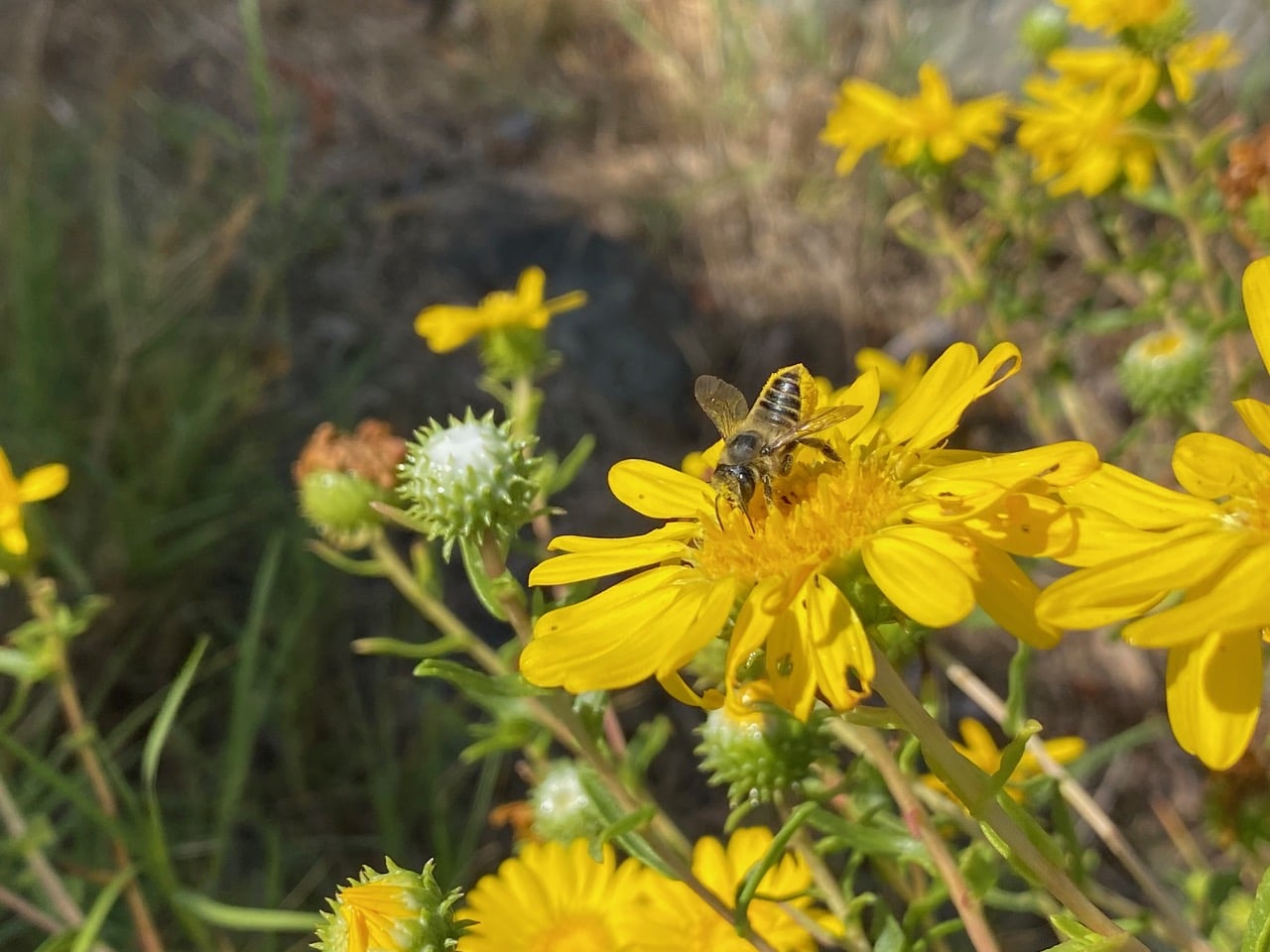 I barely got the the trail when I spot a female Western Leafcutter Bee, Megachile perihirta (family Megachilidae) out foraging on the Oregon Gumweed, Grindelia stricta flowerheads. The scopa on the underside of her abdomen is already yellow with pollen.