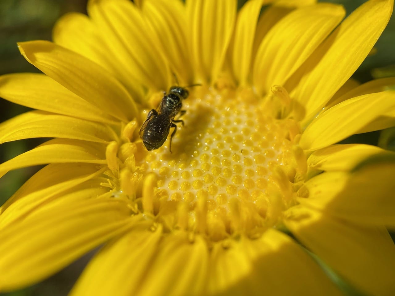 A Small Carpenter Bee, Ceratina sp. (family Apidae) is foraging on a freshly opened Grindelia flowerhead. The surface of the flowerhead still looks wet and sticky, but the bee seems to be able to navigate without problem.