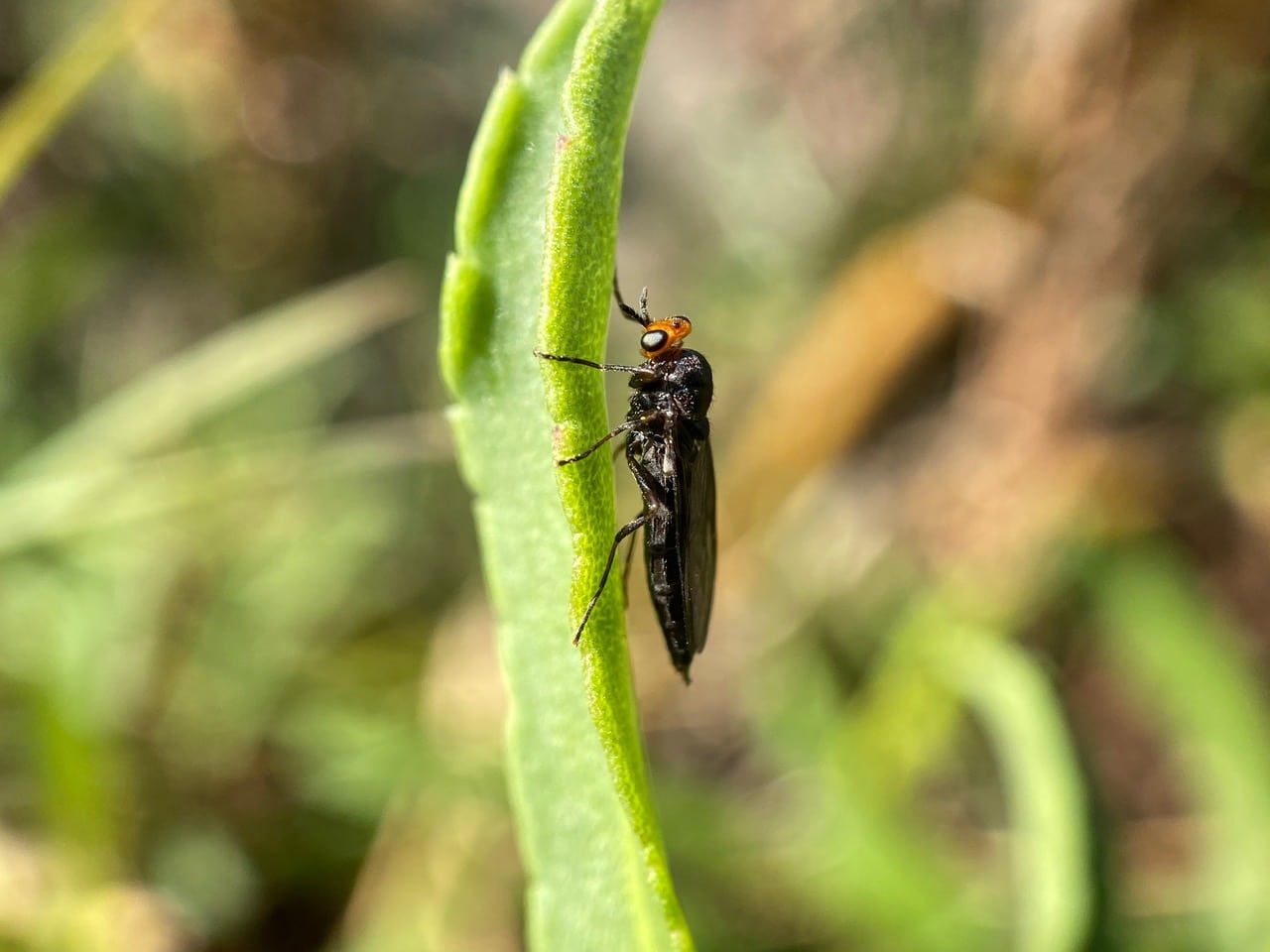 A small black insect lands on a Grindelia leaf. It is a female Sugarcane Soldier Fly (family Stratiomyidae). The Sugarcane Soldier Fly, Inopus rubriceps (family Stratiomyidae) is native to eastern Australia where it infests such crops as corn, pastures, and sugarcane. The fly was accidentally introduced into California over 50 years ago. It is now infesting lawns in San Francisco and other Bay Area counties. Damage to turf and other members of the grass family results from withdrawal of sap from roots of host plants by the larvae and possibly, injection of a toxin into the plant.