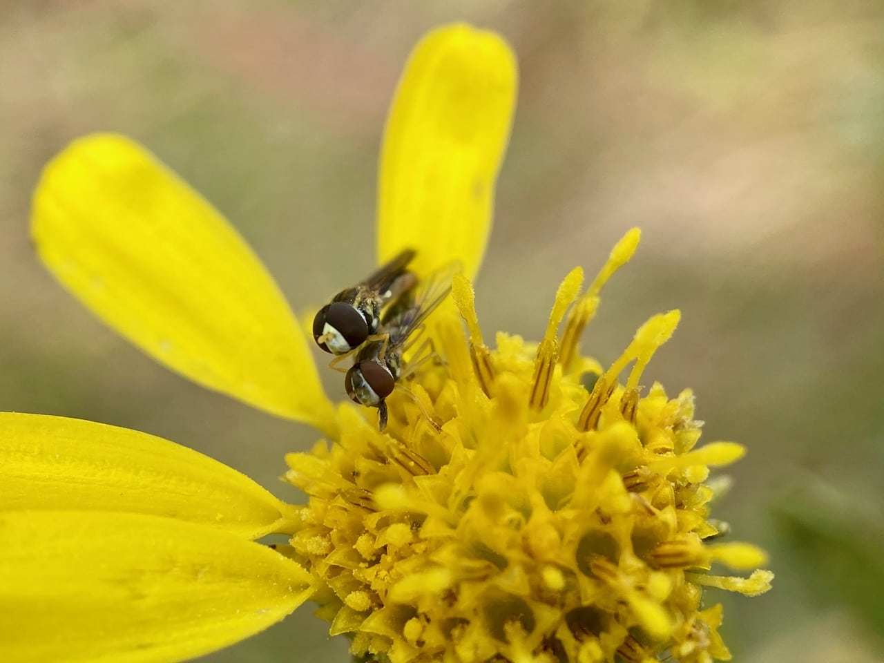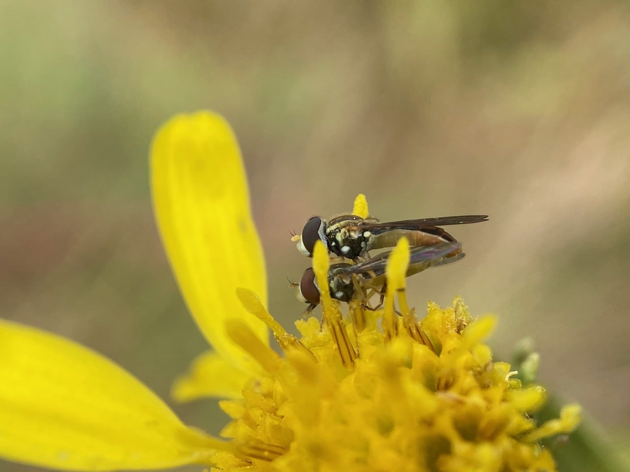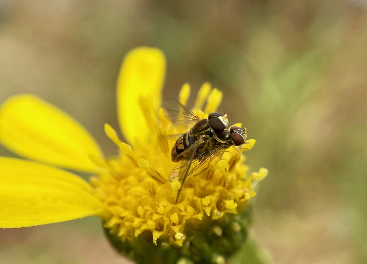 A pair of Margined Calligraphers, Toxomerus marginatus (family Syrphidae) is mating on a Grindelia flowerhead that has lost some of its ray petals. This is an unparalleled opportunity to compare the eyes of the male and female hoverflies. The male on top has holoptic eyes that meet along a central line on top of the head, while there is a gap between the female’s dichoptic eyes.