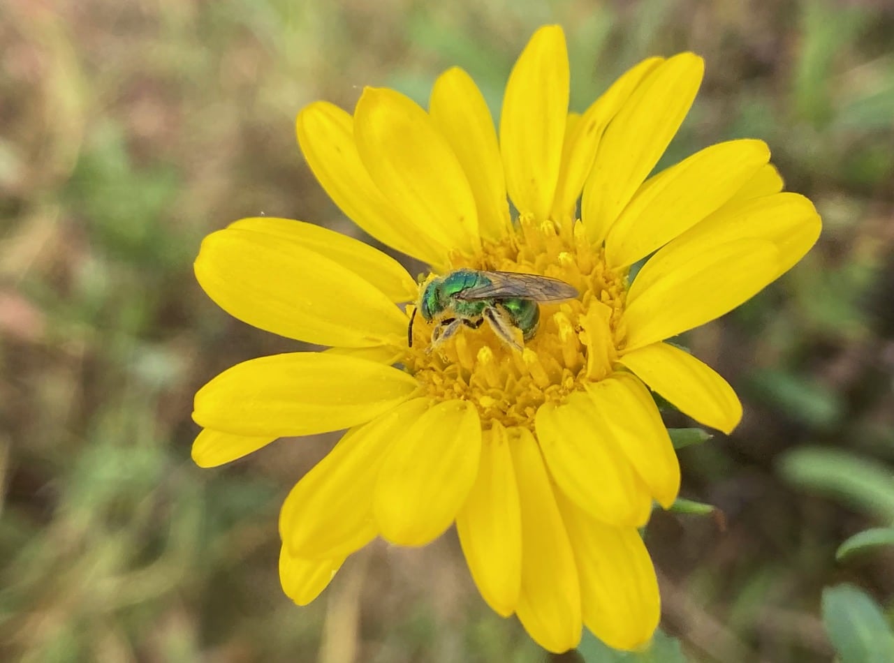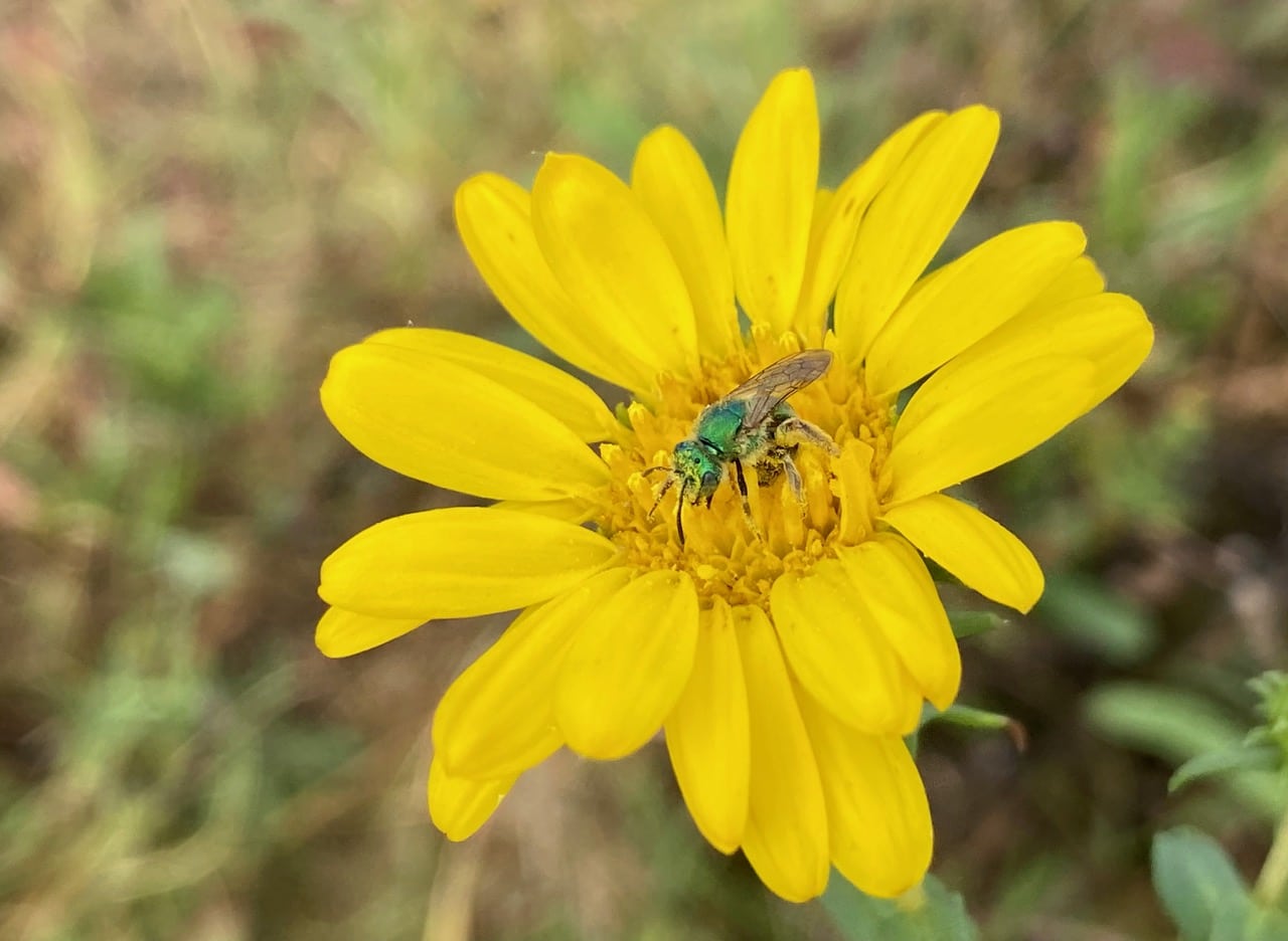 Another bee that is still active along the shoreline is the Texas Striped Sweat Bee, Agapostemon texanus (family Halictidae). Here, a female is collecting pollen on a Grindelia flowerhead.