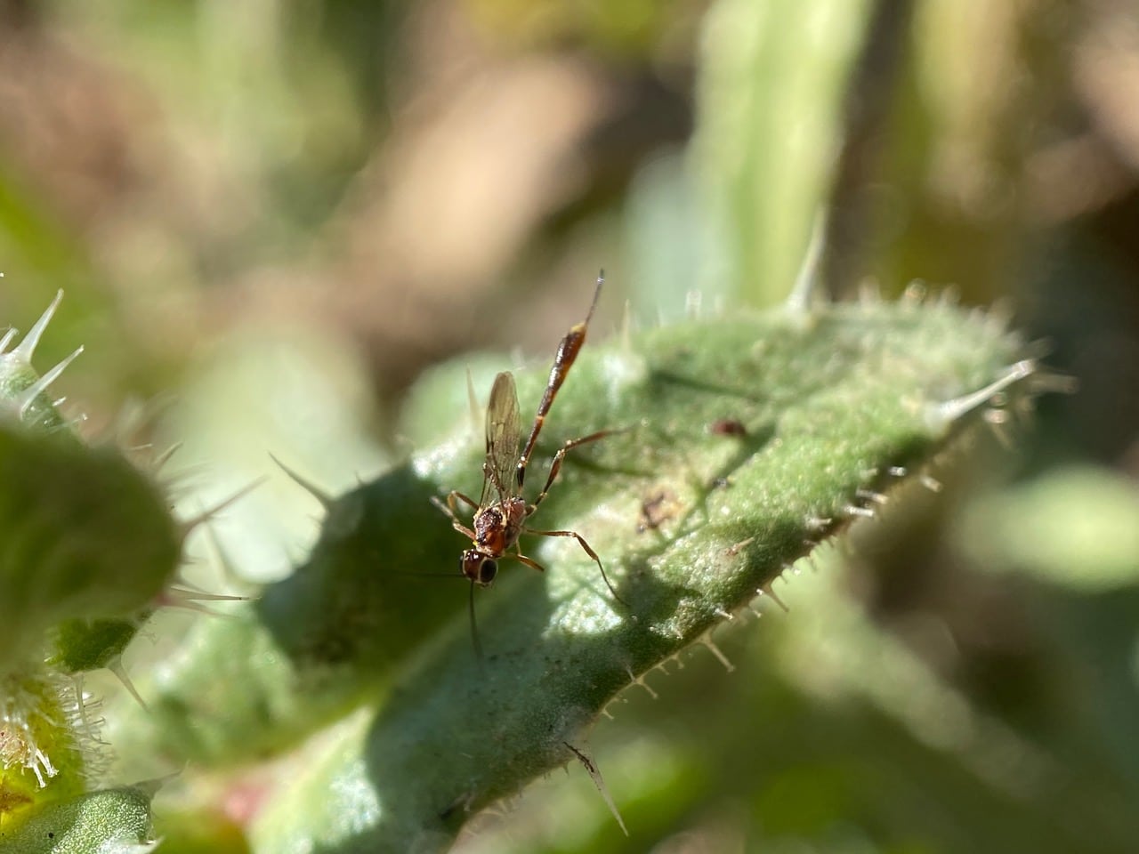 A female parasitoid wasp, Anomalon sp. (family Ichneumonidae) is grooming itself on a Bristly Oxtongue leaf. Is she here to lay eggs in the beetle larvae?