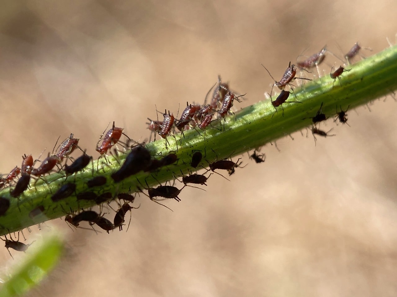 I always check out plants with aphids – something interesting is bound to happen on them. I park myself in front of an aphid-infested Bristly Oxtongue, Helminthotheca echioides and wait for the show to start.