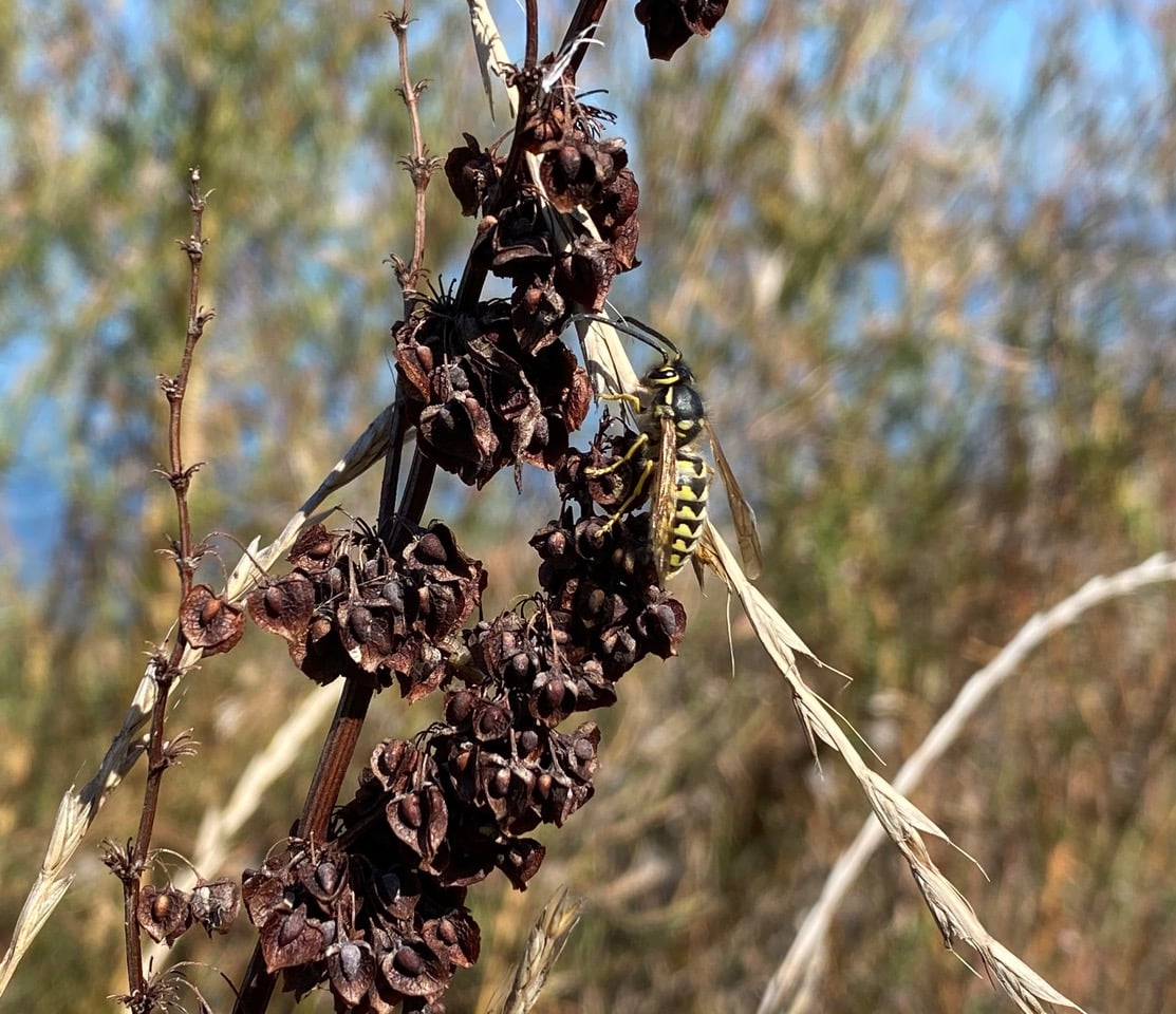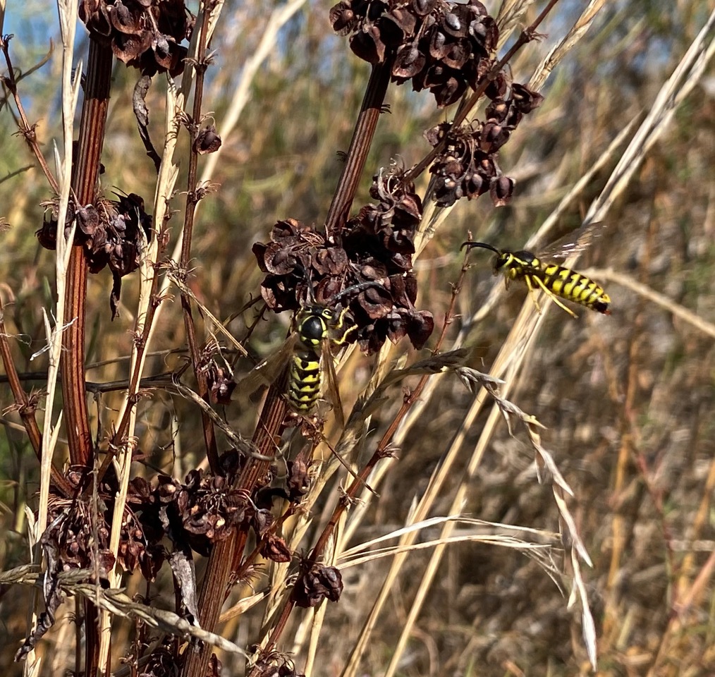 I suddenly find myself in the midst of an insect swarm. They are buzzing everywhere around me, and occasionally landing on the tall dried vegetation in frenzied clusters. When I take a good look I realize that they are Yellowjackets. Has their nest been disturbed, and they are out to defend their colony?