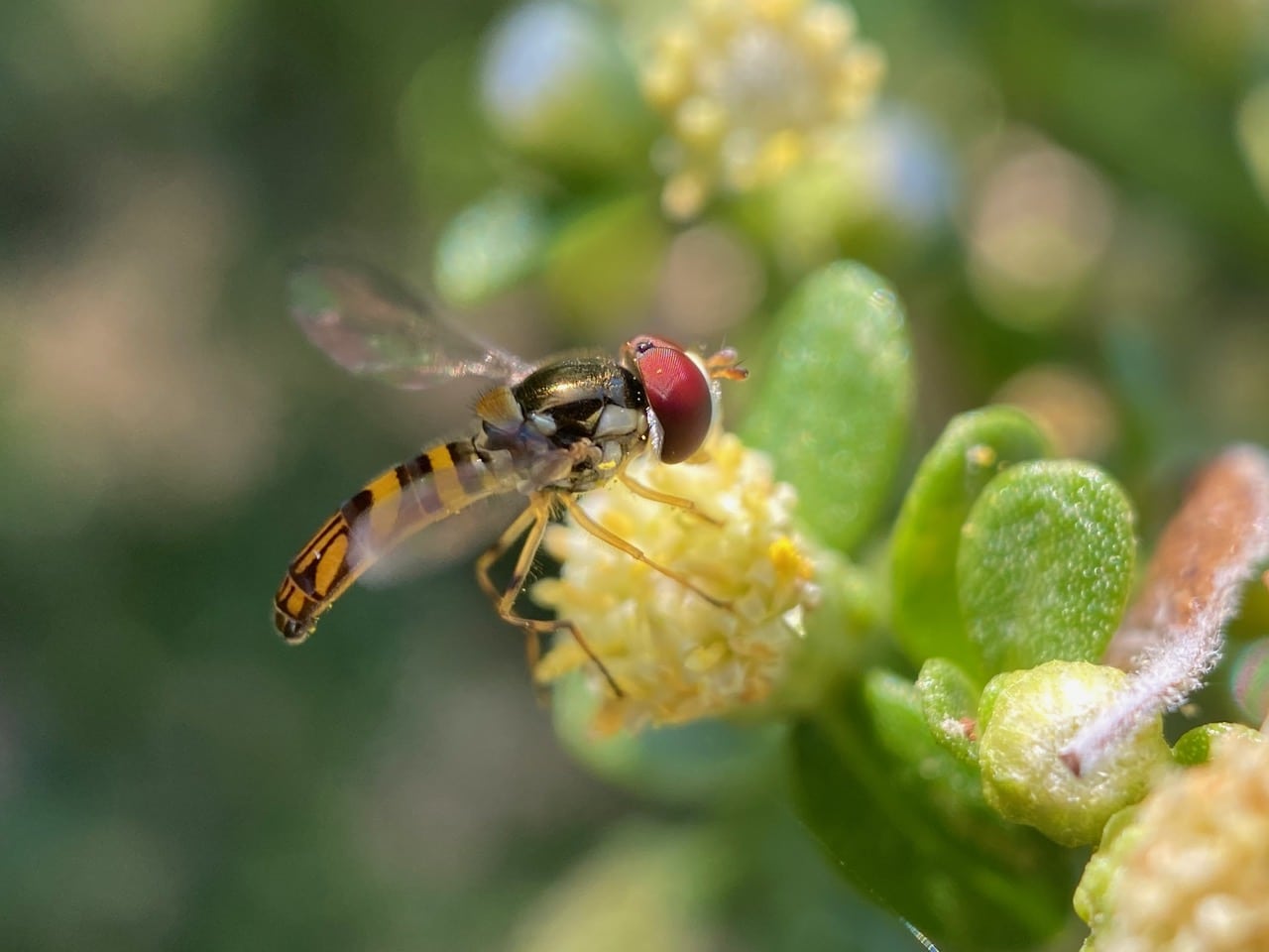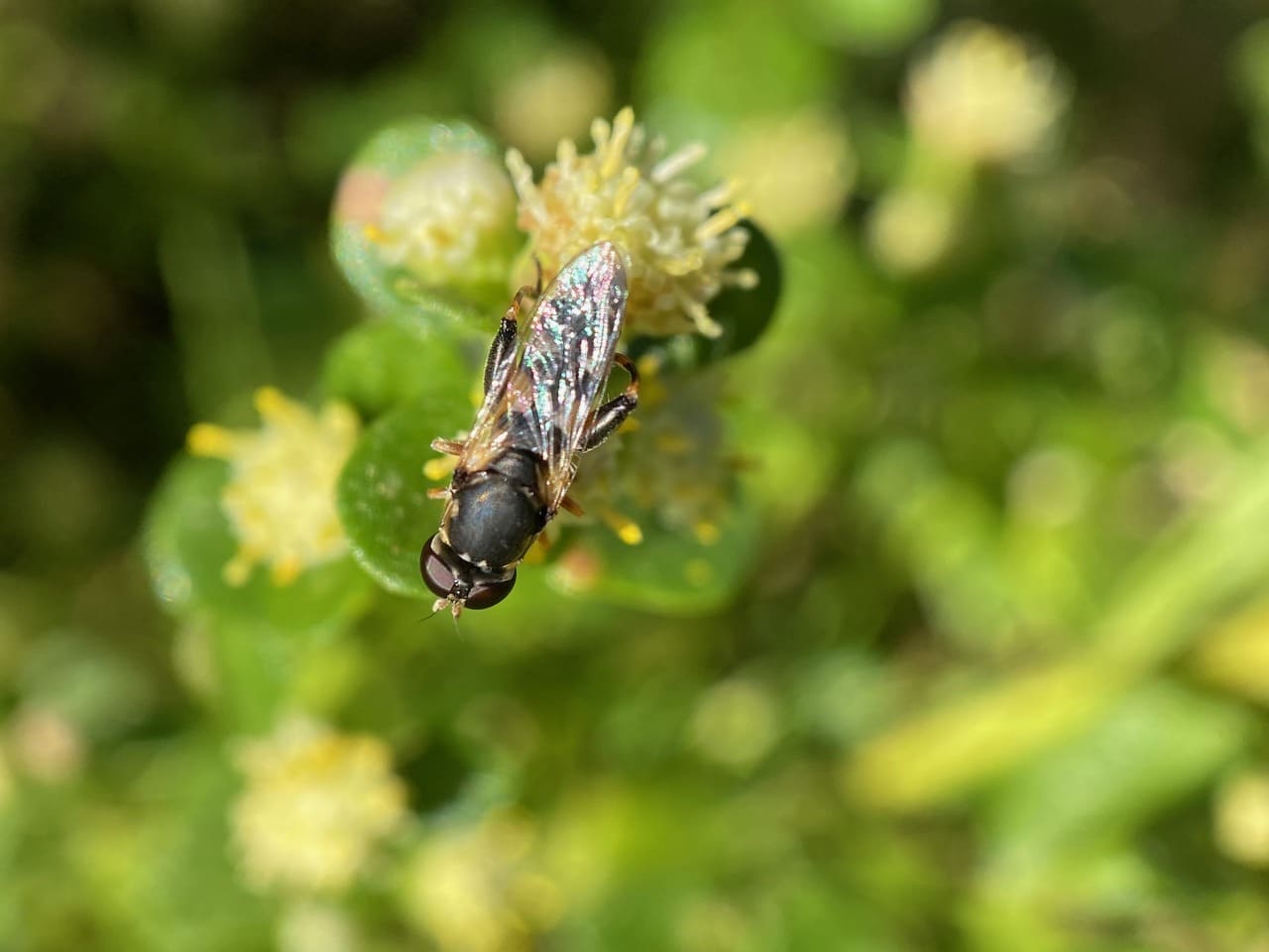 See those two rounded white flaps at the base of the wings? Those are alula. The alula is a hinged flap found at the base of wings of some flies. The alula accounts for up to 10% of the total wing area in hover flies (Syrphidae), and its hinged arrangement allows the wings to be swept back over the thorax and abdomen at rest. It is a sort of gear change mechanism.