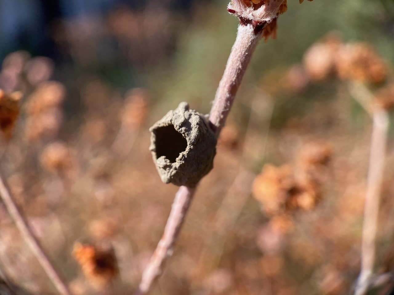 I spot a small clump of clay attached to a dried stem of the Red-flowered Buckwheat. It appears to be built from layers of wet mud – a clay nest of a Potter Wasp!