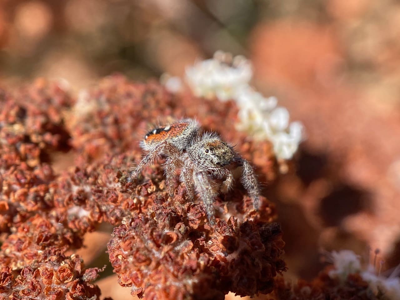 The Red-flowered Buckwheat, Eriogonum grande var. rubescens in the front garden has mostly dried up and gone to seed. A female Johnson’s Jumping Spider, Phidippus johnsoni (family Salticidae) is almost invisible on the dried inflorescences.