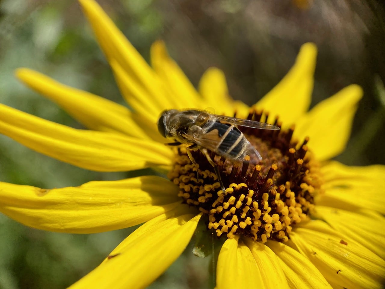 A Eurasian Drone Fly, Eristalis arbustorum (family Syrphidae) is foraging on an Encelia flowerhead.