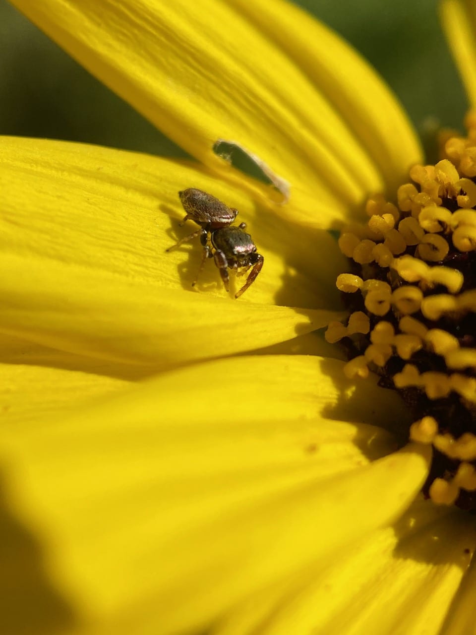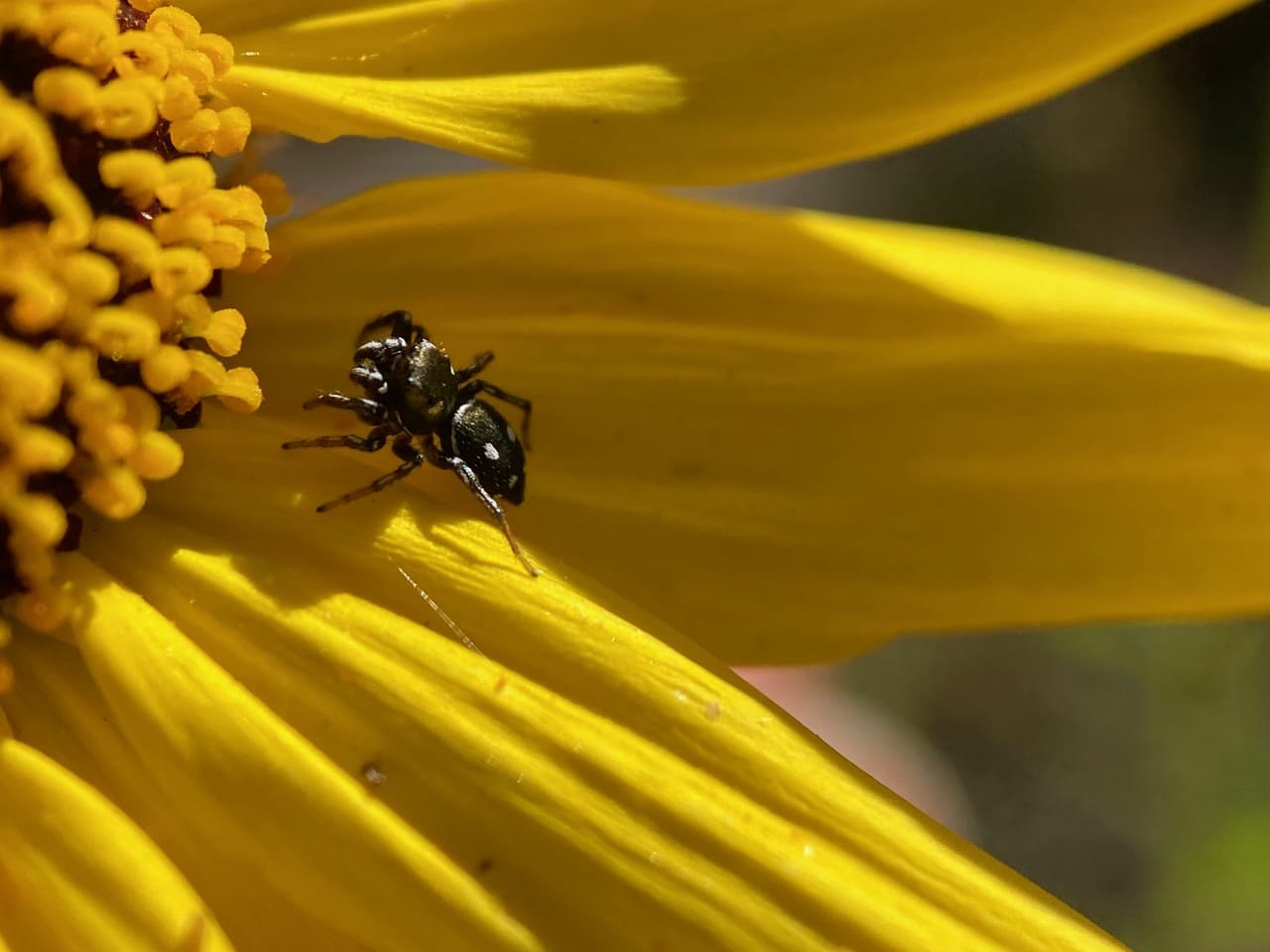 A tiny, shiny jumping spider is patrolling an Encelia flowerhead. It is easily recognized as the Buttonhook Leafbeetle Jumping Spider, also known as the Grapevine Jumping Spider, Sassacus vitis (family Salticidae)