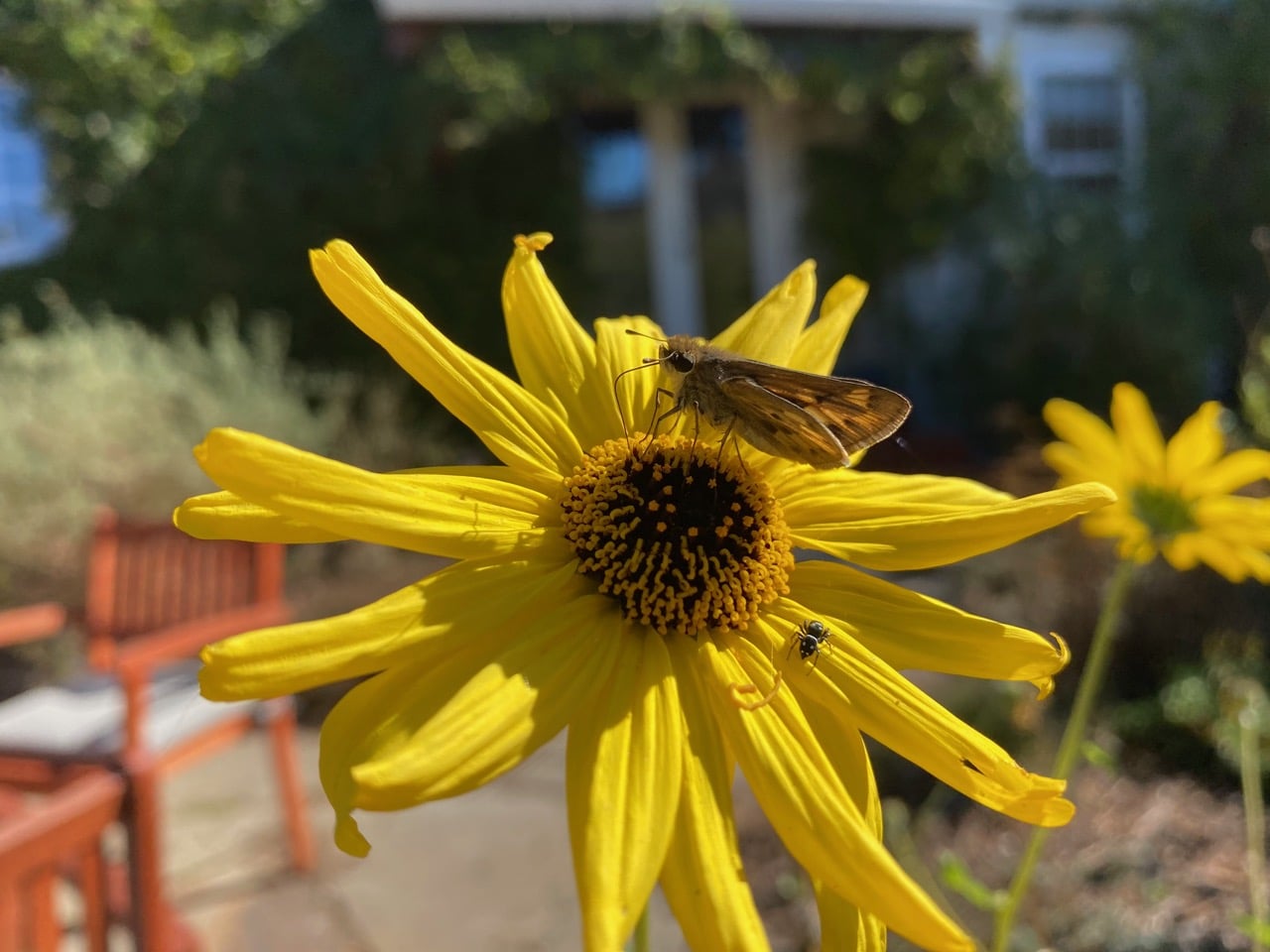 A Skipper landing on an Encelia flowerhead puts a tiny jumping spider on full alert.