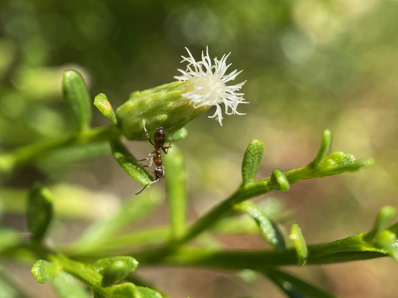 Numerous Argentine Ants, Linepithema humile (family Formicidae) are visiting the flowerheads of the female Coyote Brush. Female flowers do not produce pollen, but the nectar they produce is obviously attractive to many insects.