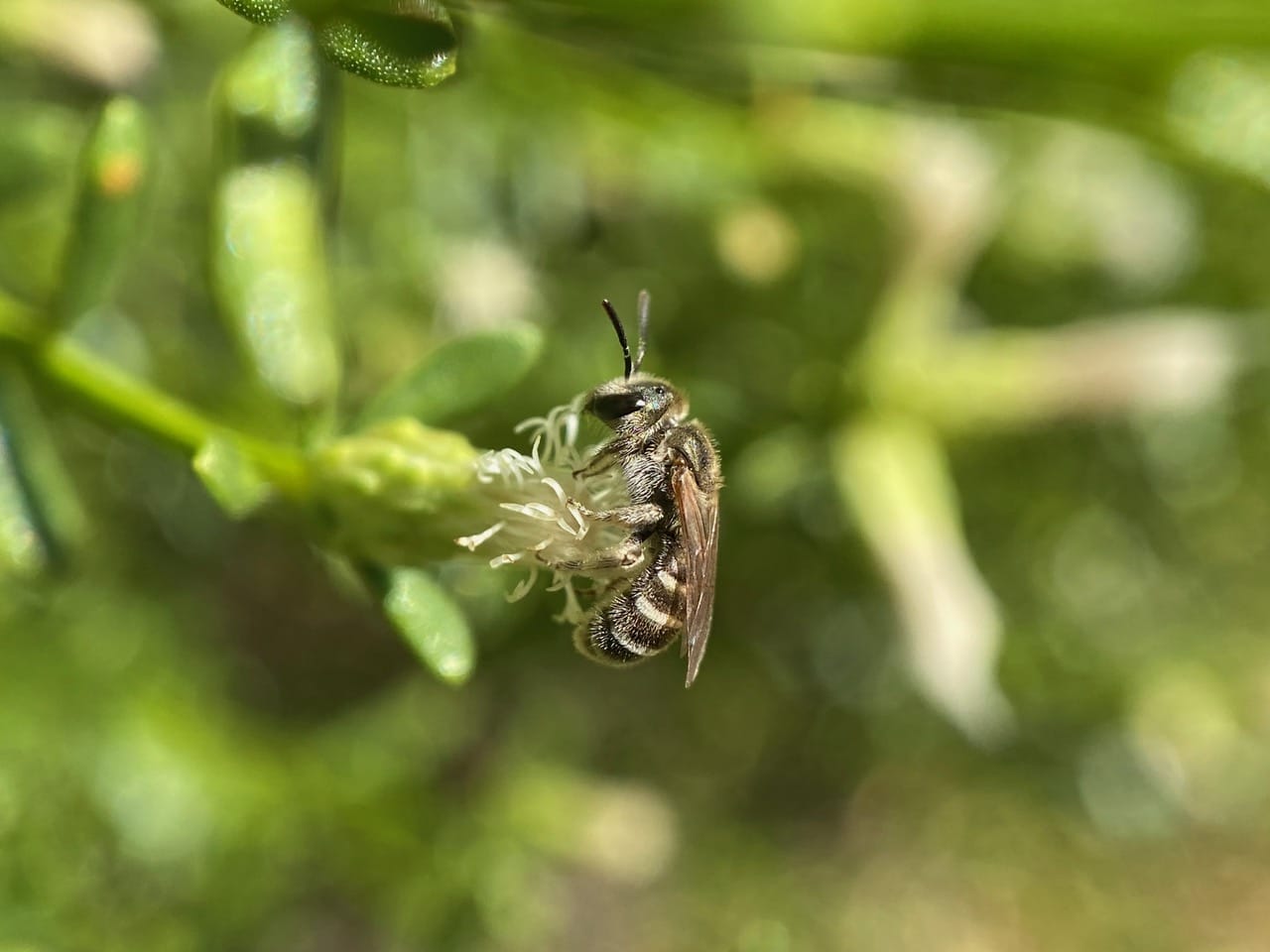 The bee makes a full circle on the flowerhead over the little “candles”, scraping and kicking up pollen and rapidly tapping it into her abdominal scopa.