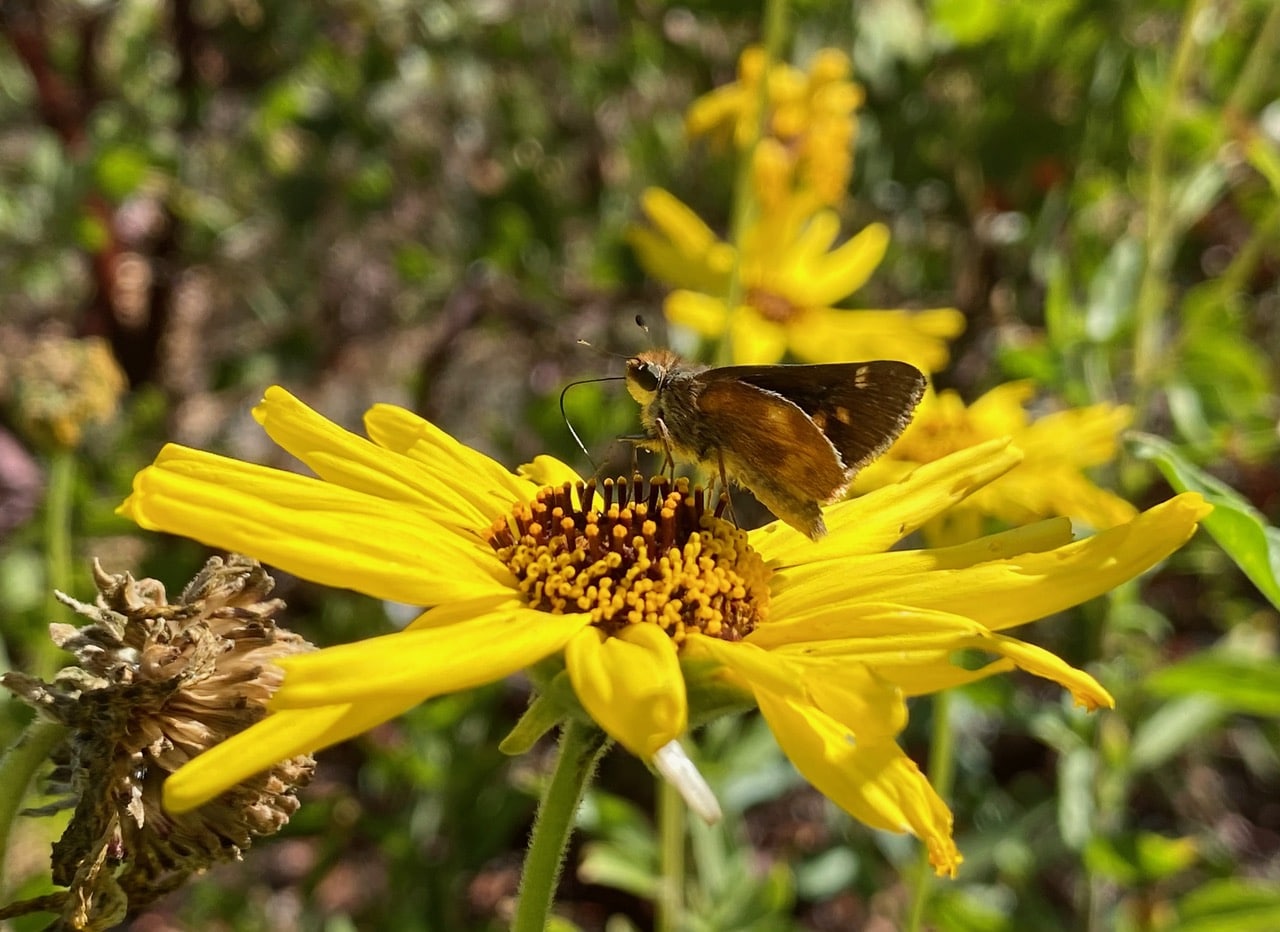 A Skipper butterfly (family Hesperiidae) is taking nectar from an Encelia flowerhead. With its long, flexible proboscis, the butterfly can probe for and access nectar from multiple florets in one sitting.