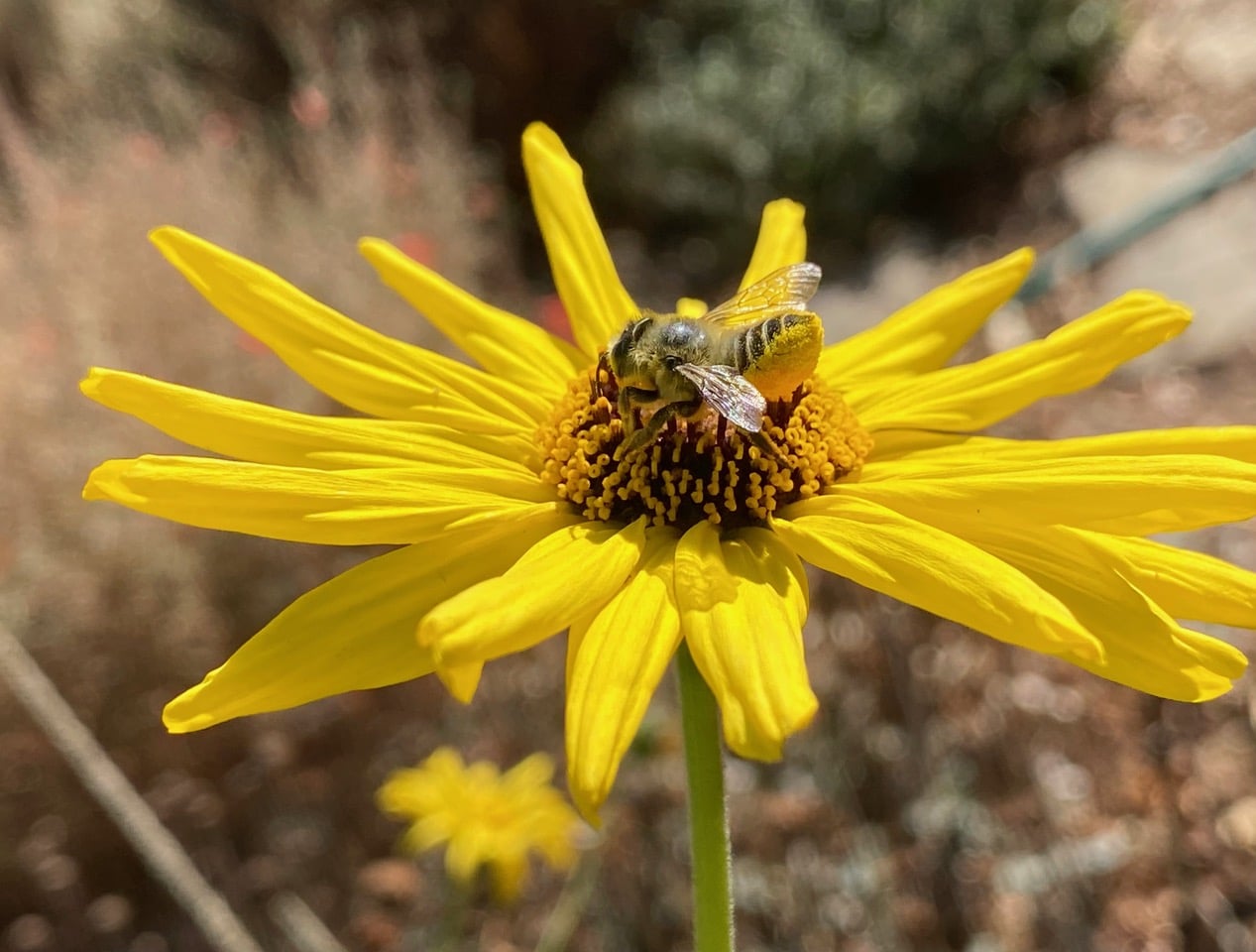 Wow, that’s a full load! Back at her nest, the female will scrape off the pollen from her abdomen, and mix it with some nectar to make a loaf of “bee bread” in a brood chamber. She will then lay an egg on the loaf and seal up the chamber with a piece of cut leaf or petal. She will go on to forage to provision all the nest chambers, and lay more eggs. The bee bread in each brood chamber is sufficient to nourish the larva until pupation.