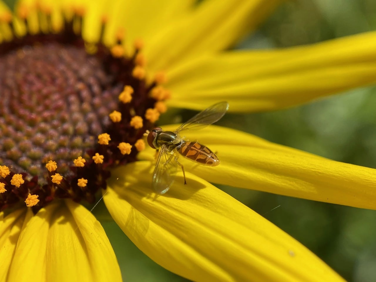 Toxomerus marginatus, also known as the Margined Calligrapher is a common species of hoverfly found in North America. These are small hoverflies, measuring 5-6 mm in length. The abdomen is black and yellow, and is narrowly margined with yellow. Adults are found in diverse habitats such as forests, fields, meadows, marshes, deserts, and alpine areas. They are highly adaptable and can occur is very disturbed habitats. Larvae prey on aphids, thrips, mites, and small caterpillars. Adults visit flowers for nectar and pollen.