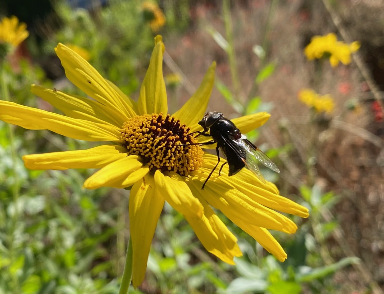 Most of the plants in the backyard have gone dormant and neatly pruned back. The only plant still offering nectar and pollen is the two California Bush Sunflower, Encelia californica that continue to bloom. They now form the hub of insect activity. A Purple Bromeliad Fly, Copestylum violaceum (family Syrphidae) is taking nectar on a flowerhead of California Bush Sunflower.