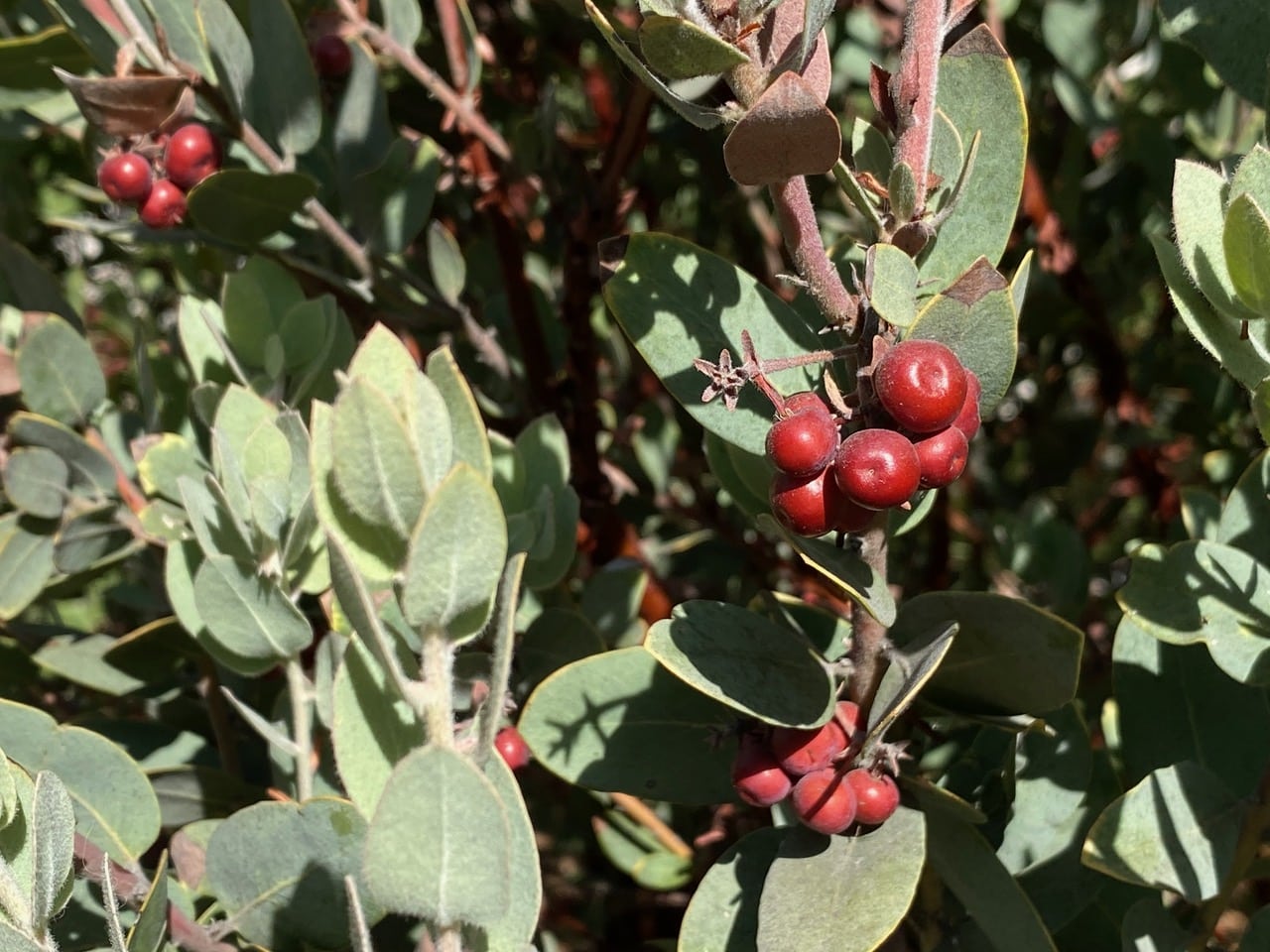 The grey-leafed Manzanita on the side of Stefanie’s house, Arctostaphylos silvicola ‘Grey Eagle’ has produced a bountiful crop of “little apples”. The name “manzanita” is derived from the Spanish word meaning “little apple” in reference to the berry which appears on the shrub in late summer. The fruits are edible and can be eaten ripe (when red). The fruit is a berry-like drupe that contains 3-4 seeds that are protected by a very dense, impervious layer of carpellary tissues. Wildlife cherish these calorie-packed fruits. Mammals such as foxes often leave scat studded with Manzanita seeds along the trail, inadvertently serving as seed dispersers.