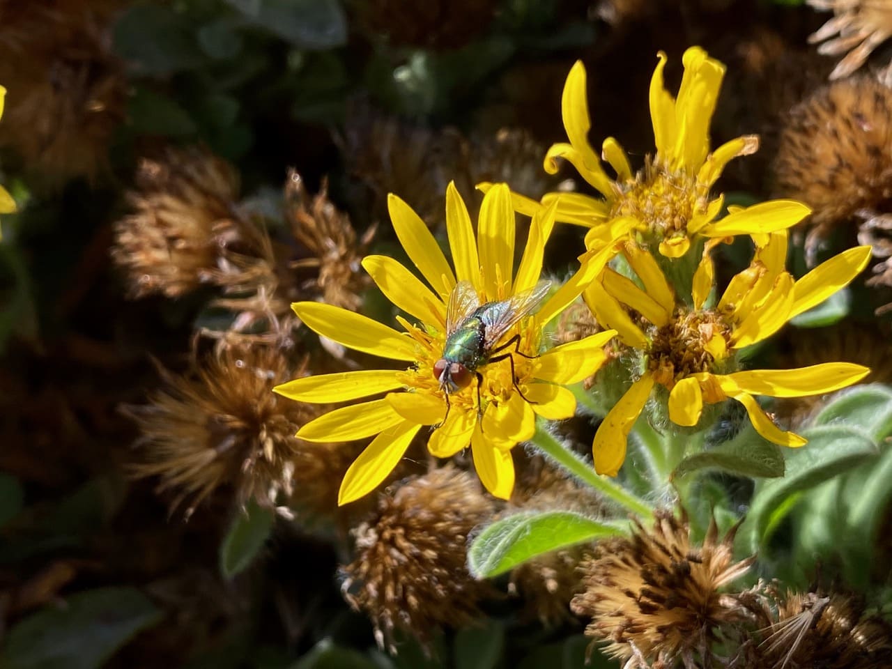 A Common European Greenbottle Fly, Lucilia sericata (family Calliphoridae) lands on a flowerhead of San Bruno Mountain Sessileflfower Goldenaster, Heterotheca sessiliflora ssp. bolanderi ’San Bruno Mountain’.