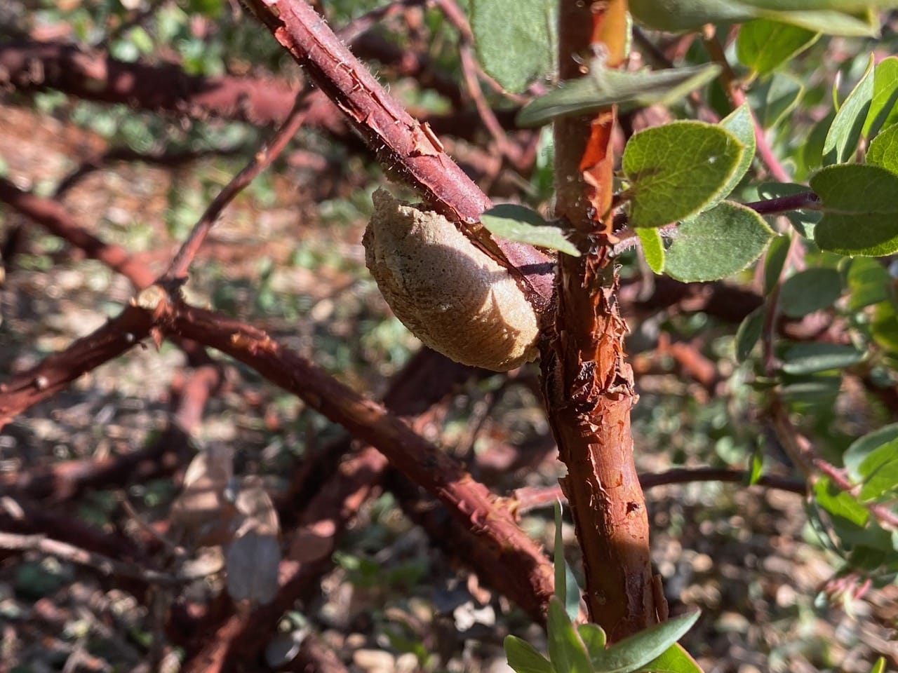 Before I even ring Stefanie’s doorbell, I have already found the Praying Mantis egg case on the Manzanita in her front yard. Stefanie has recently told me that the ootheca was discovered by the pruning team from Merritt College’s Horticulture Department while holding a pruning class in her garden. What a delightful find! The ootheca is still intact, with no exit holes. So the babies have yet to emerge!