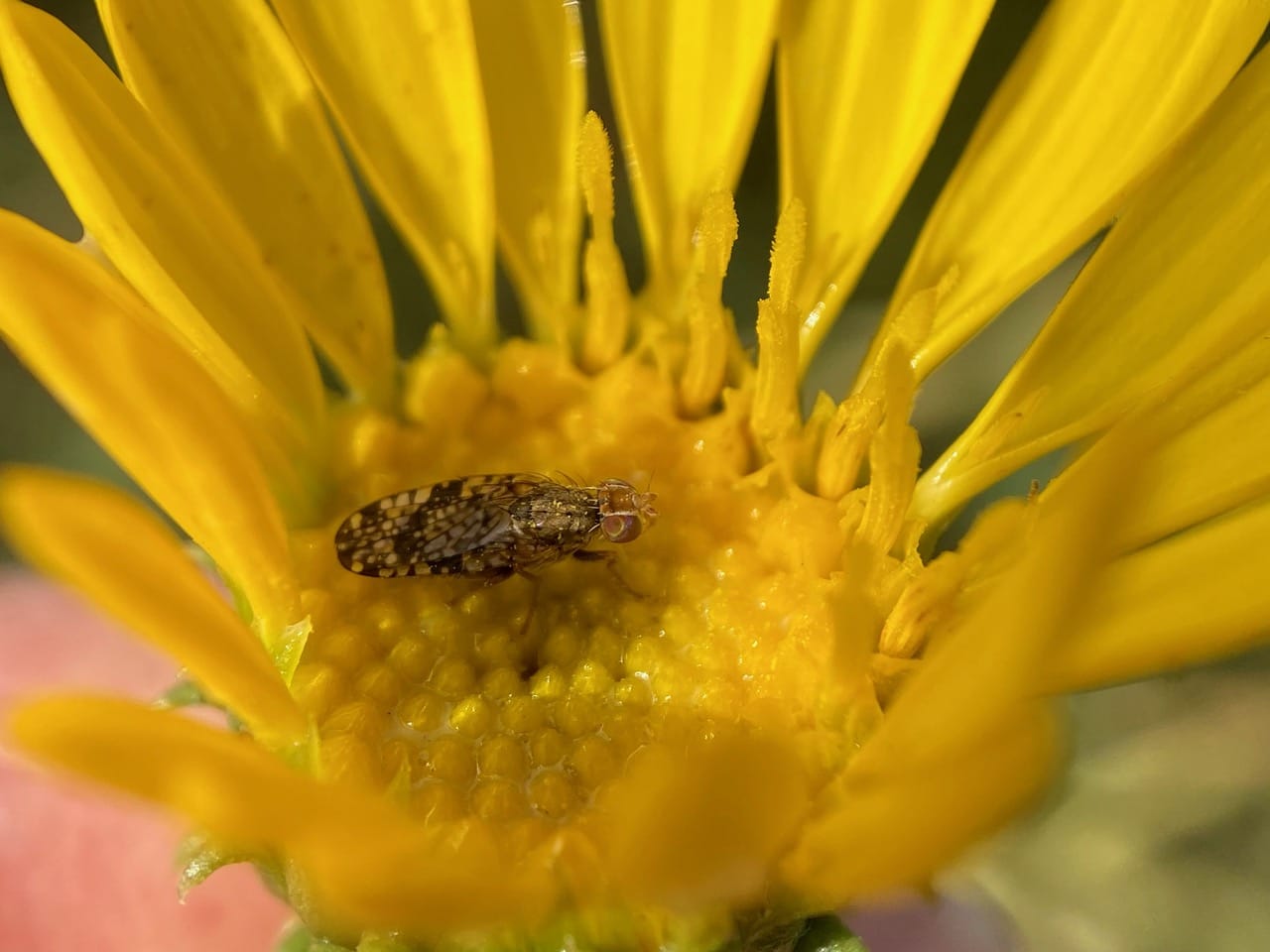 A small fly with picture wings is perched on a freshly opened Grindelia flowerhead. It is a Fruit Fly, Campiglossa sp. (family Tephritidae). I can’t tell its gender because its abdomen is covered by the wings. But if it is a female, she might be here to lay her eggs among the florets.