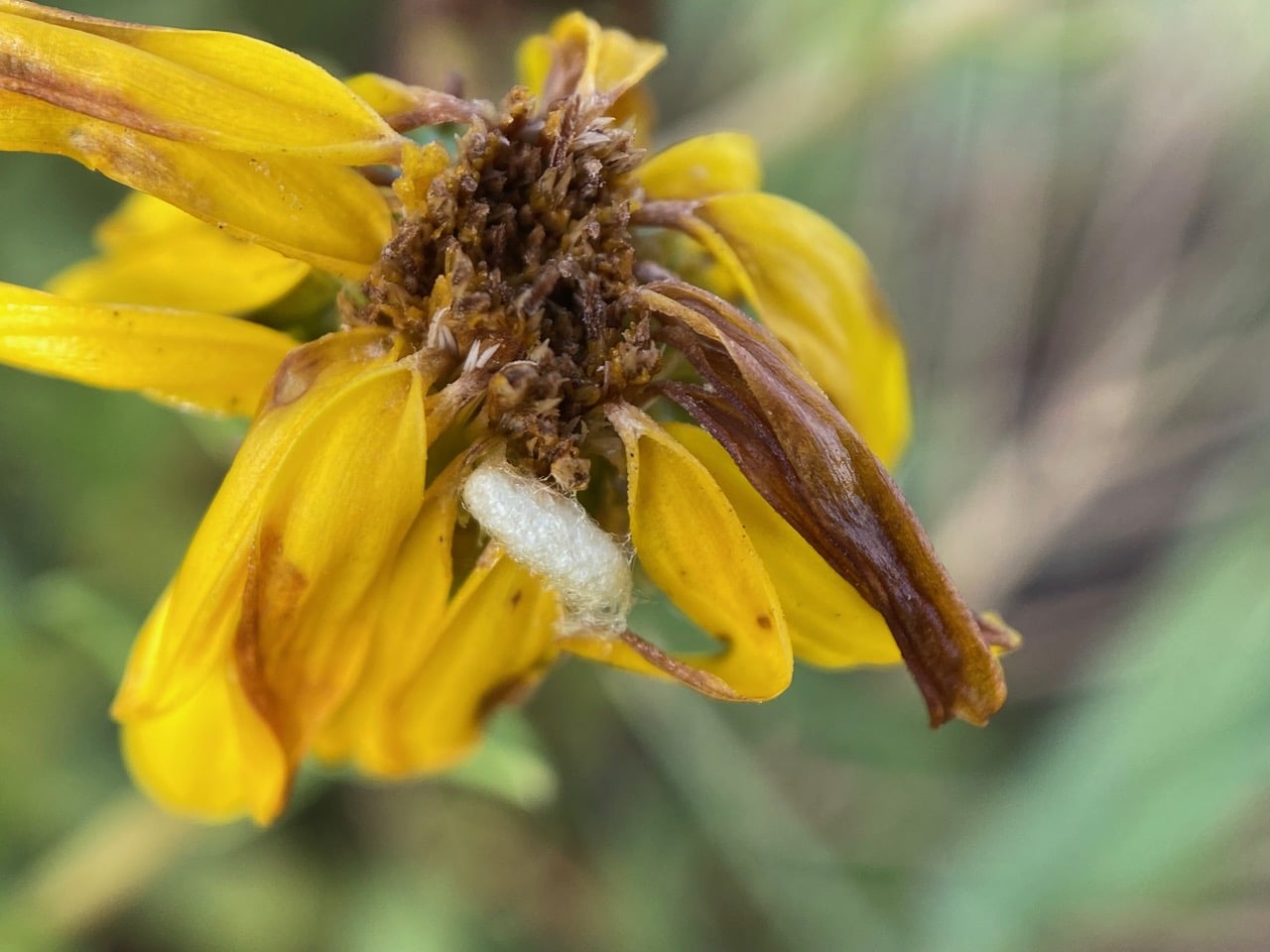 A silken cocoon is attached to a fading Grindelia flowerhead. What’s inside? I often find small Pug Moth caterpillars (genus Eupithecia) on the Grindelia flowerheads, feeding on the flower parts. But these caterpillars typically descend from their host plant and pupate in the leaf litter or soil at the base of the plant. In fact the size and shape of the cocoon reminds me of those spun by Braconid Wasps that parasitize caterpillars.