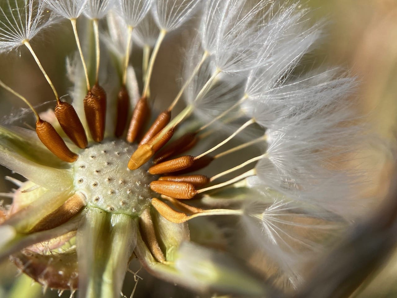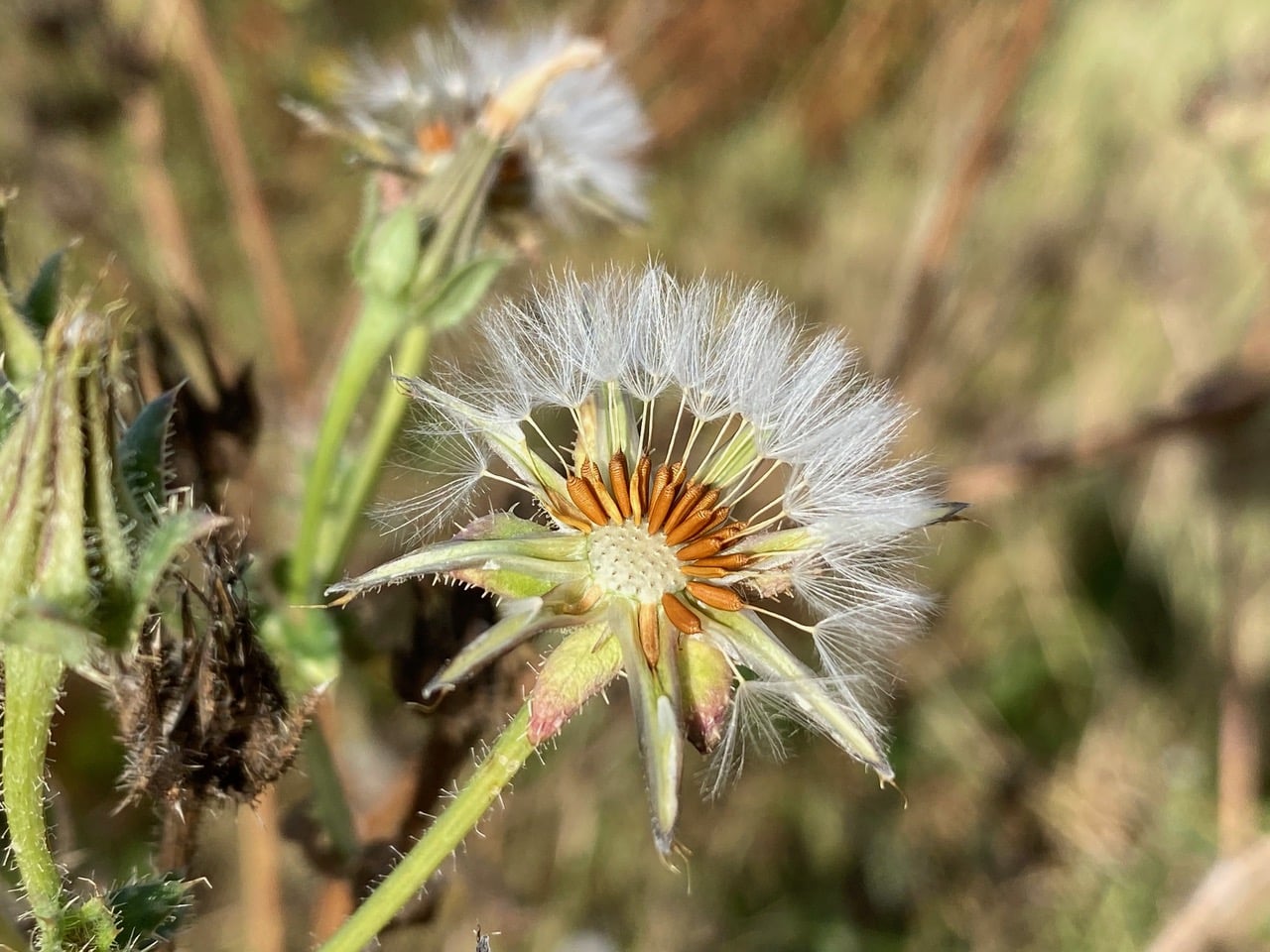 The seed head of the Bristly Oxtongue is similar in structure to that of the Dandelion. After all, both are in the Asteraceae family. The plumes of a dandelion puffball are the pappus, which is the parachute-like structure attached to each individual seed.