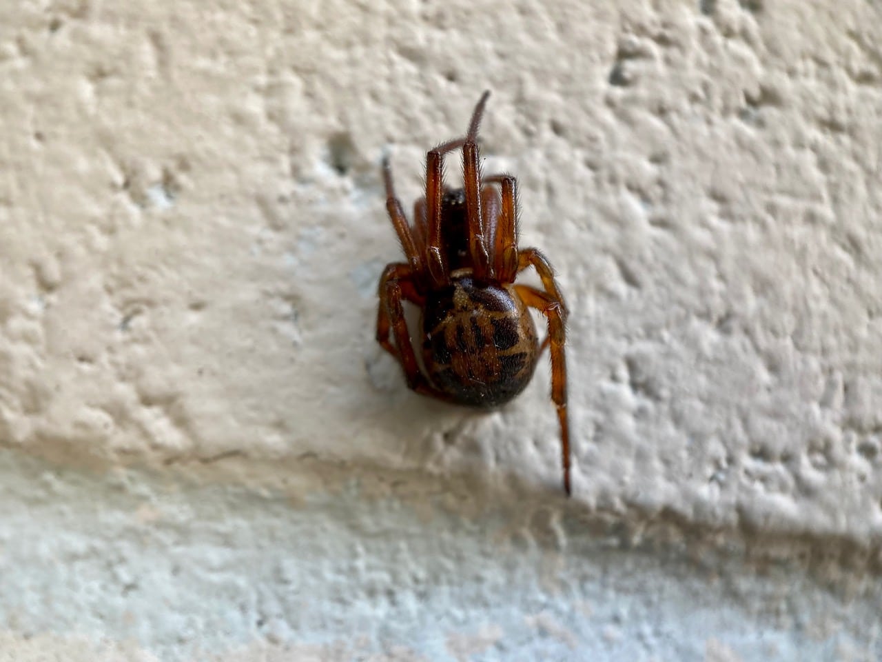 The Noble False Widow, Steatoda nobilis superficially resembles the black widow spider (genus Latrodectus), hence the common name of ‘false widow’. The spider is native to Madeira and the Canary Islands from where it has spread to Europe and other parts of the world including the United States. It can be found all year round, both indoors and outdoors in a variety of habitats including cacti, roadside cuttings, and demolished buildings. In California they have been observed in urban habitats but have also spread to natural habitats. They are hefty spiders with females measuring 9.5 – 14 mm in size.