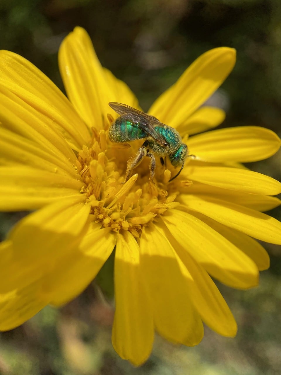 A female Fine Striped Sweat Bee, Agapostemon subtilior (family Halictidae) is foraging on a Grindelia flowerhead.
