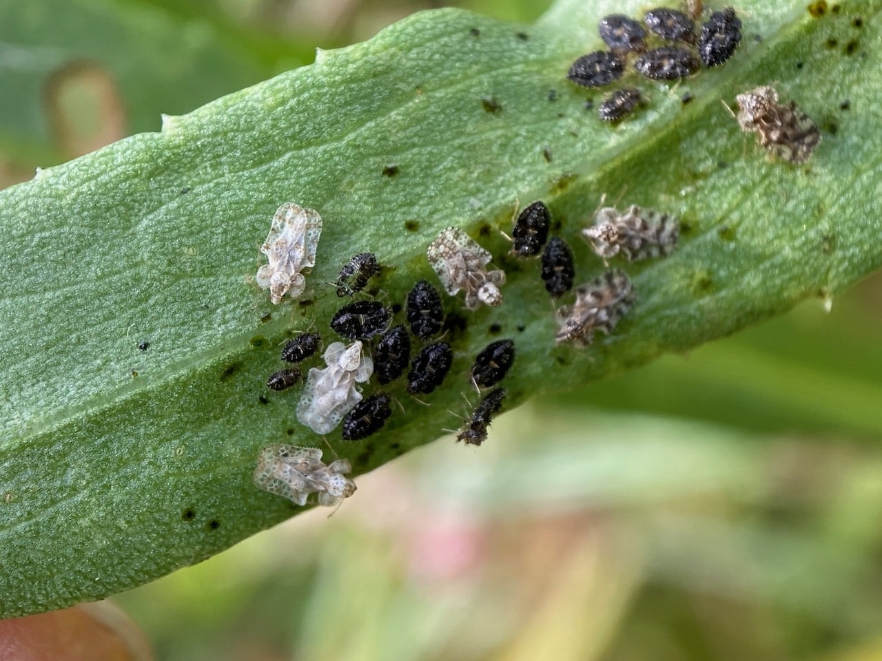 Turning over a Grindelia leaf, I find this aggregation of adult and nymphal Lace Bugs, Corythuca sp. (family Tingidae). The adults have beautiful, lacy wings, while the nymphs are black and bristly.