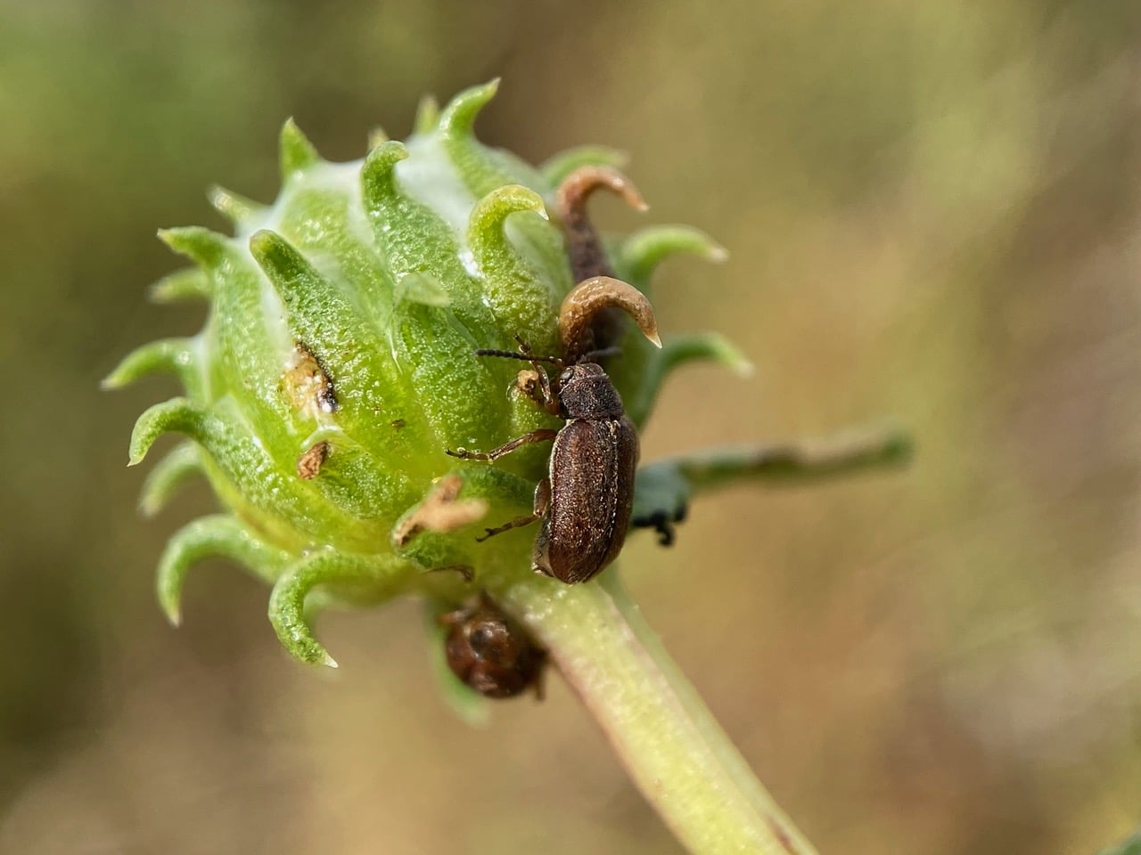 A pair of small, brown beetles are mating at the base of an immature Grindelia flowerhead.