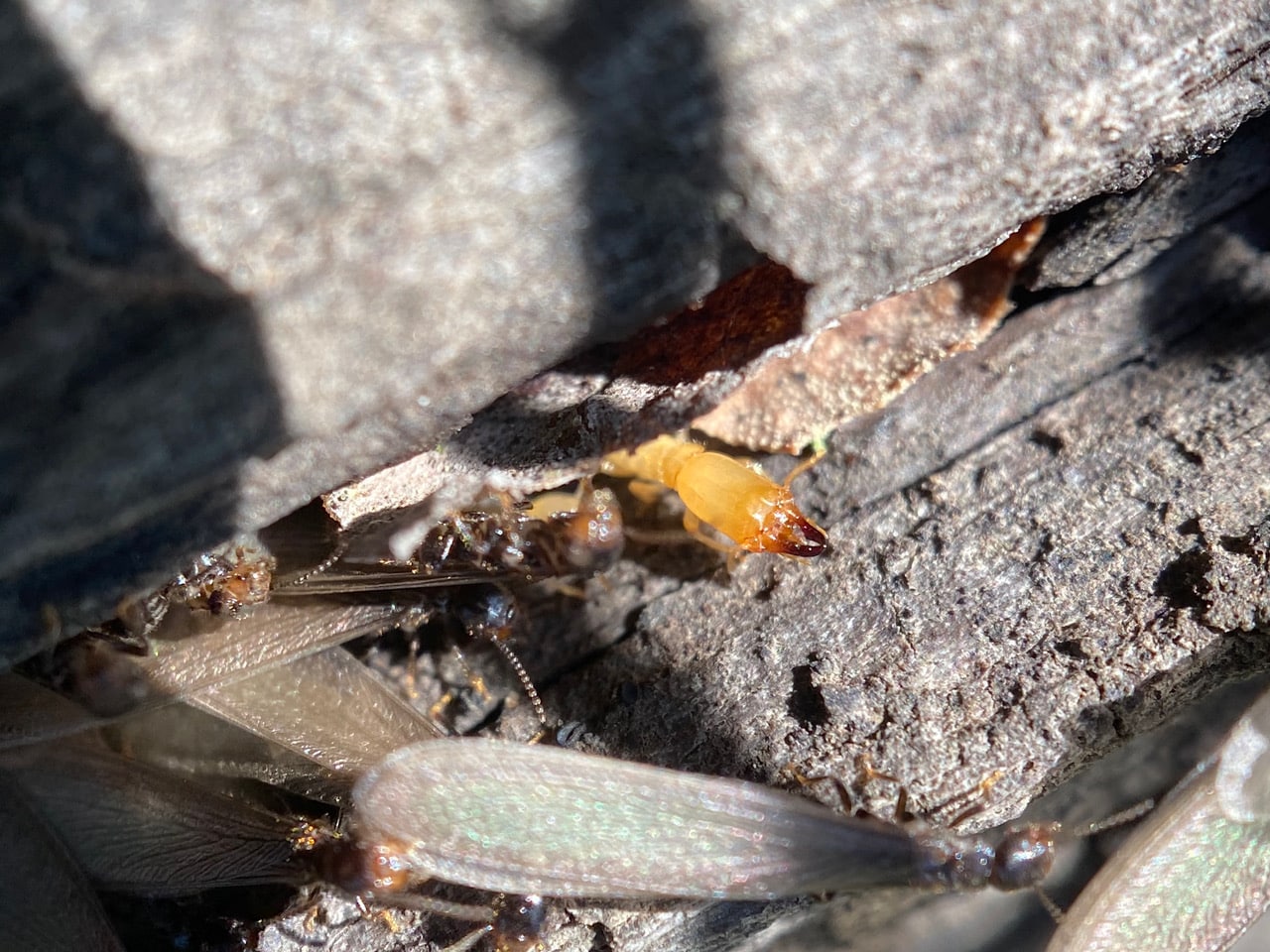 Oh, look, there’s a worker! That pale termite with the rounded head is a worker.
