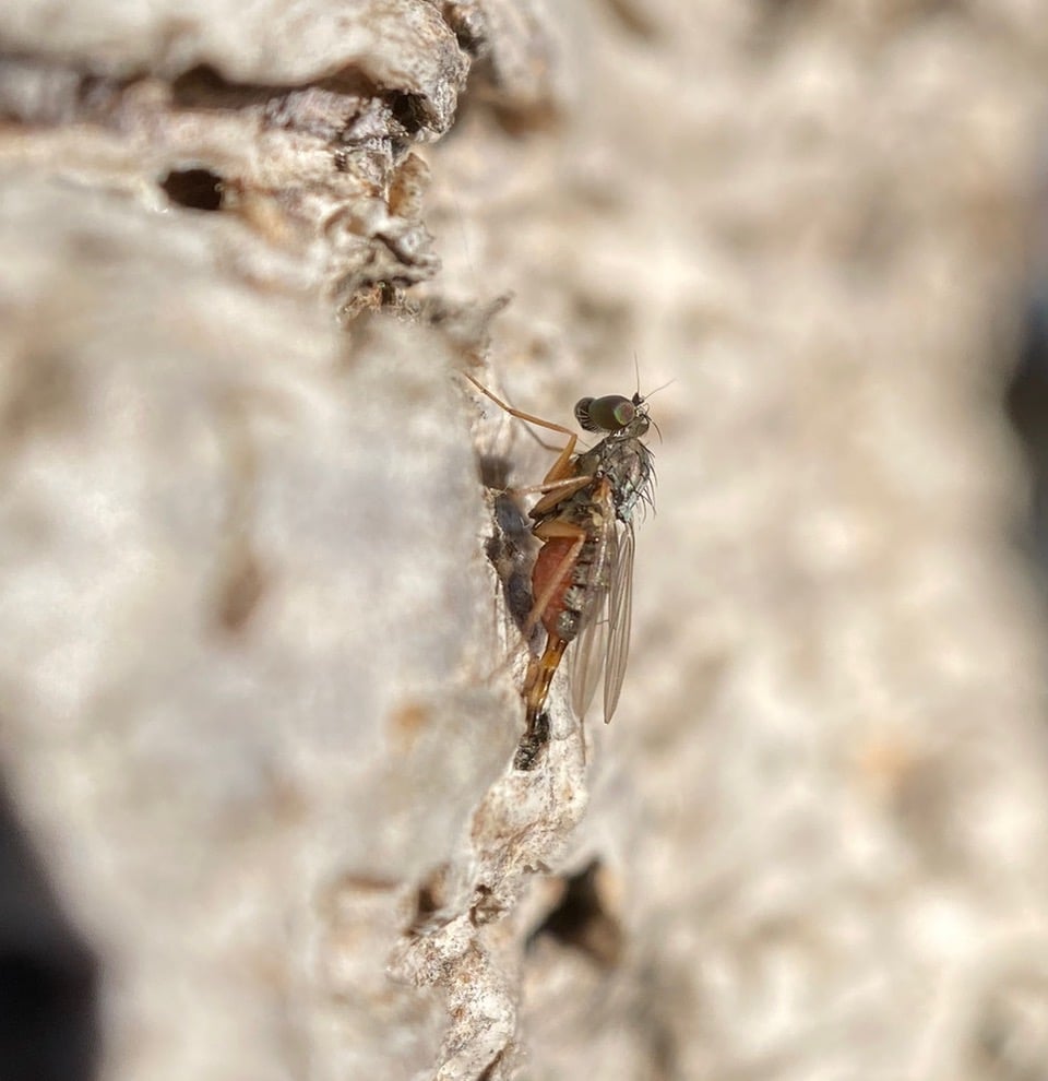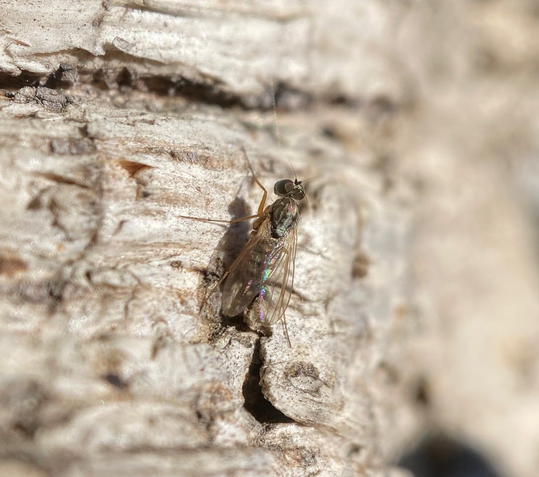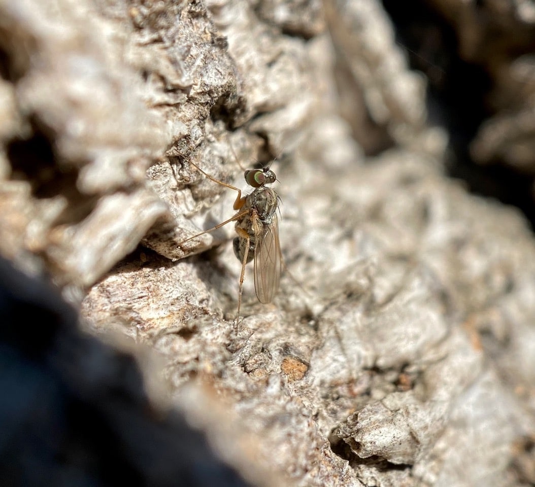 The Woodpecker Fly, Medetera is a large genus in the family Dolichopodidae. The adults are commonly found resting on vertical surfaces such as tree trunks, on which they have a characteristic vertical upright stance reminiscent of the woodpecker bird. Medetera adults are predators of soft-bodied arthropods, while the larvae are predators of bark beetle larvae.