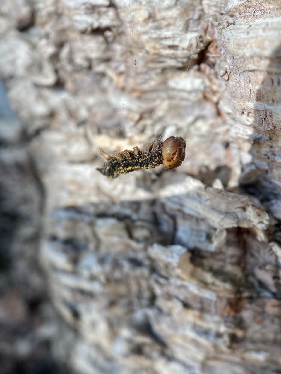 Dangling on strands of silk a shriveled California Oak Moth caterpillar with a cracked head capsule is blowing in the wind. A victim of predation?