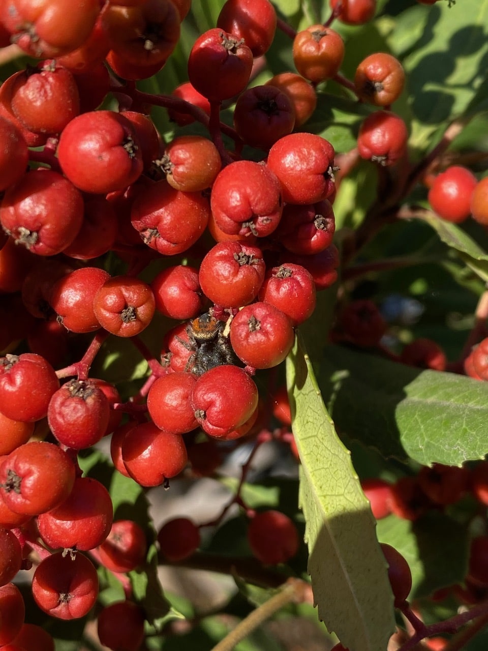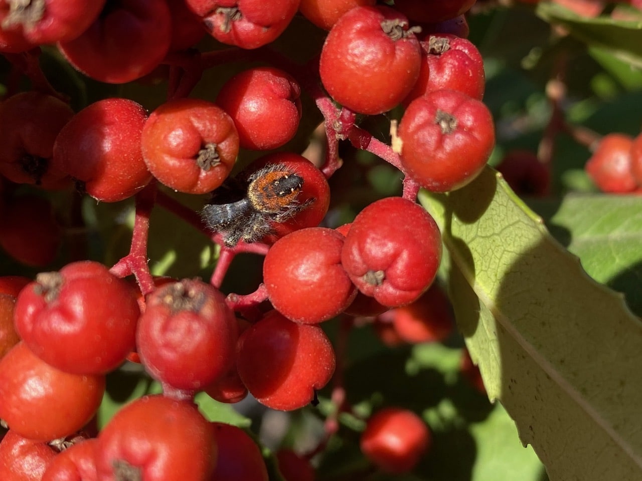 Arriving early at Mendocino Park where Anita and I have planned to meet, I stop by to admire a neighbor’s Toyon, Heteromeles arbutifolia that is loaded with bright red berries. A sudden movement among the berries alerts me to the presence to a well-camouflaged Johnson’s Jumping Spider, Phidippus johnsoni (family Salticidae). Do you see it?