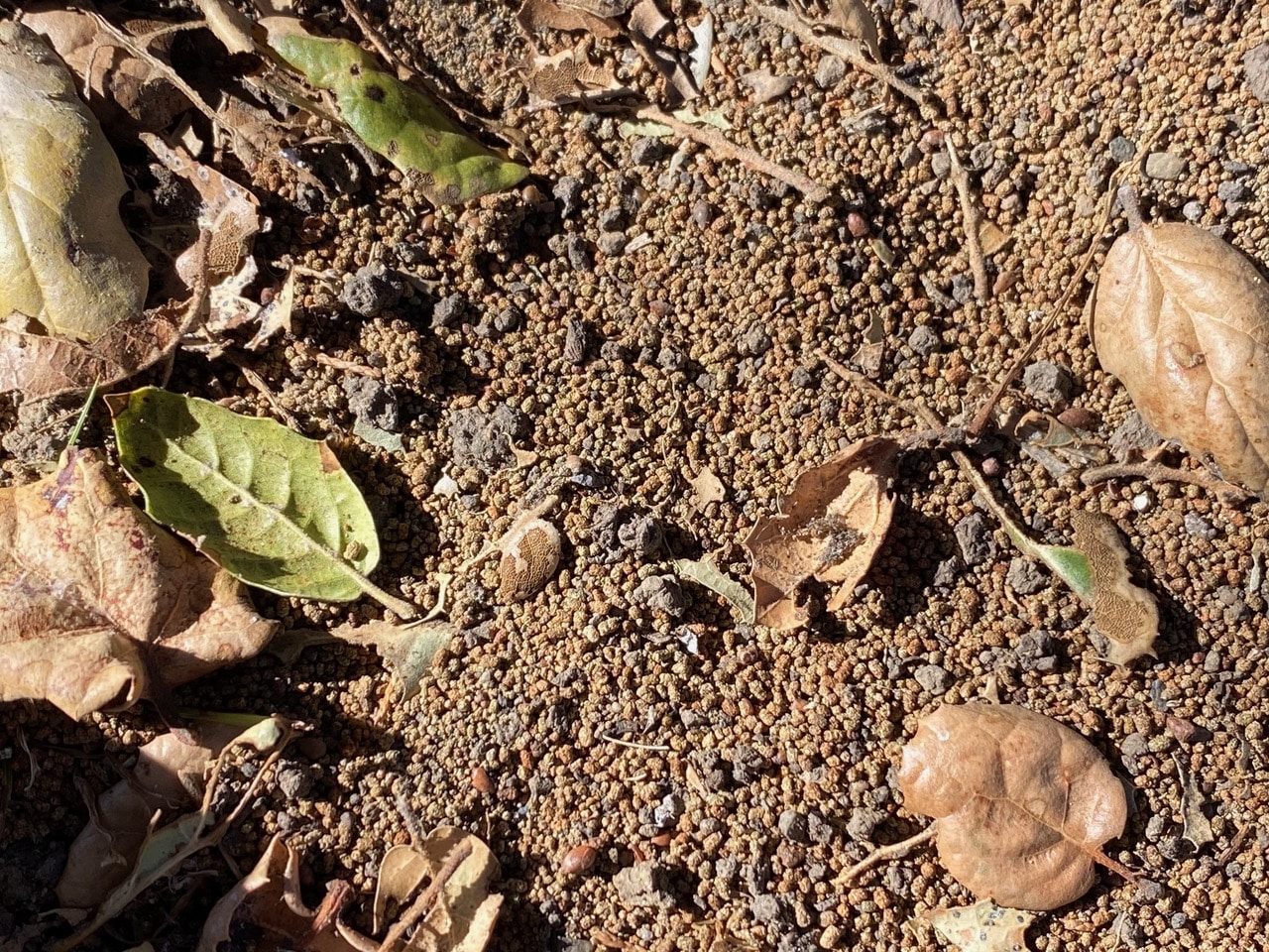 We next visit the large Coast Live Oak in the front yard of Anita’s neighbor and fellow Mendocino Park volunteer, Margot. The tree is severely infested with the California Oak Moth, almost defoliated. I look down on the ground under the tree, and feel a irrepressible smile coming over my face. The carpet of grainy caterpillar frass (insect poop) brings back fond memories.