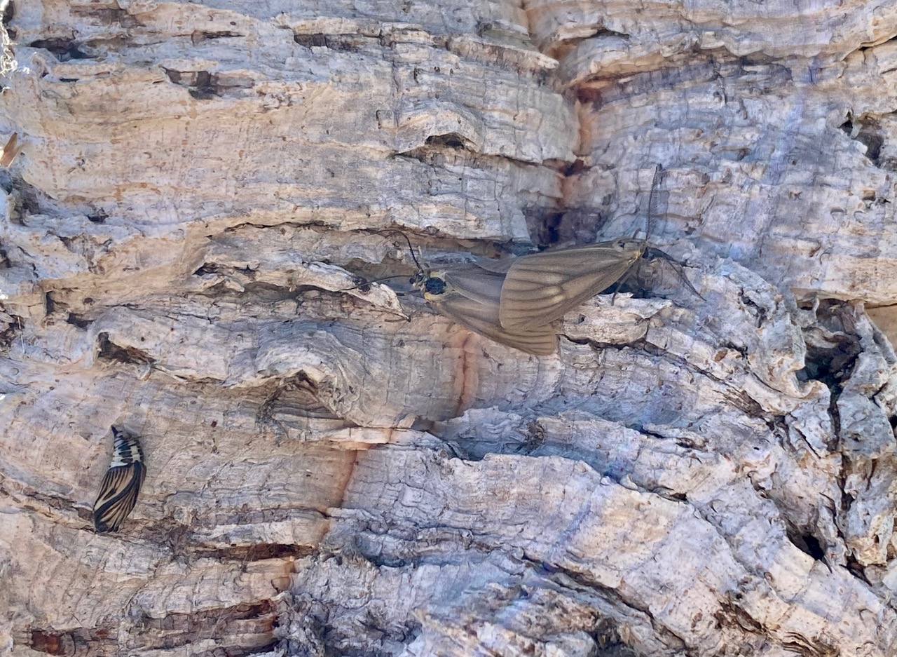 With a small twig, I quickly remove the spider web from the struggling young moth. It wriggles for a while, then remains still, apparently exhausted. It is still attached to it pupa case when we leave. Transition at every stage of a moth’s life is rife with danger.