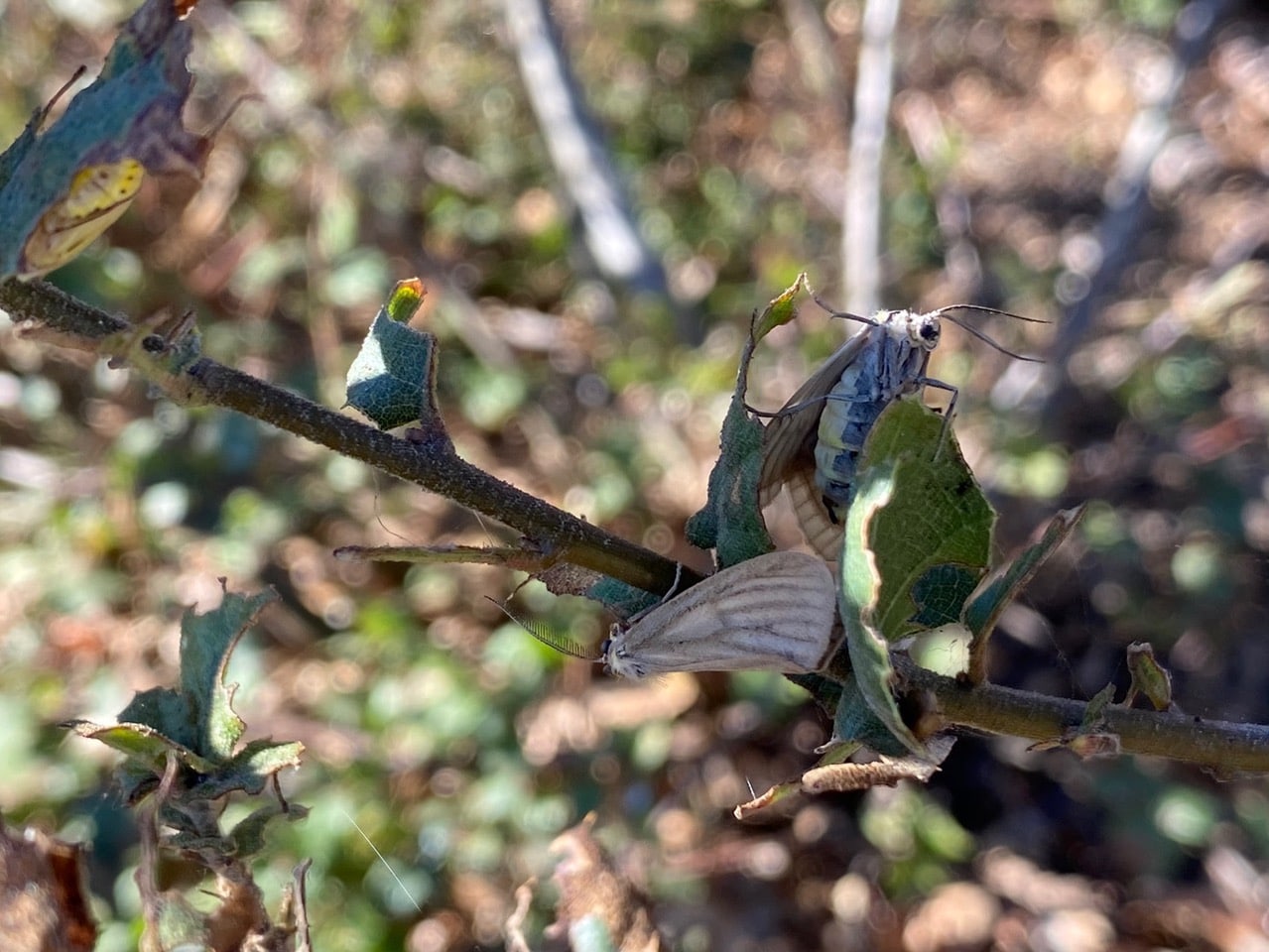 Sharp-eyed Anita spots a pair of California Oak Moths mating in the dappled shade of the shrubby oak. The pair separates as I approach with my camera. The one on the lower left is clearly the male, with feathery antennae. The other is a gravid female with a large abdomen.