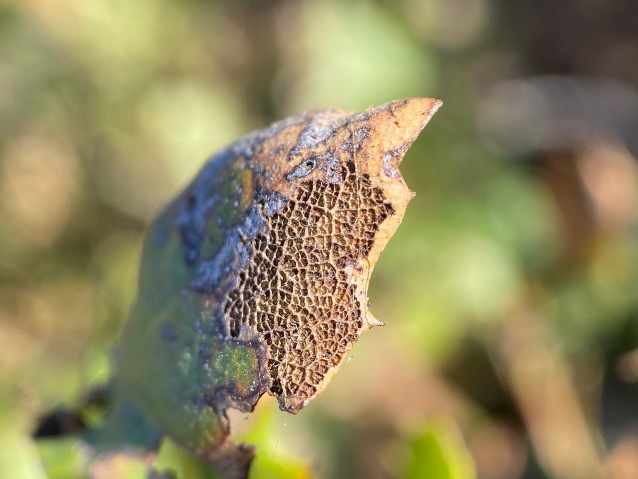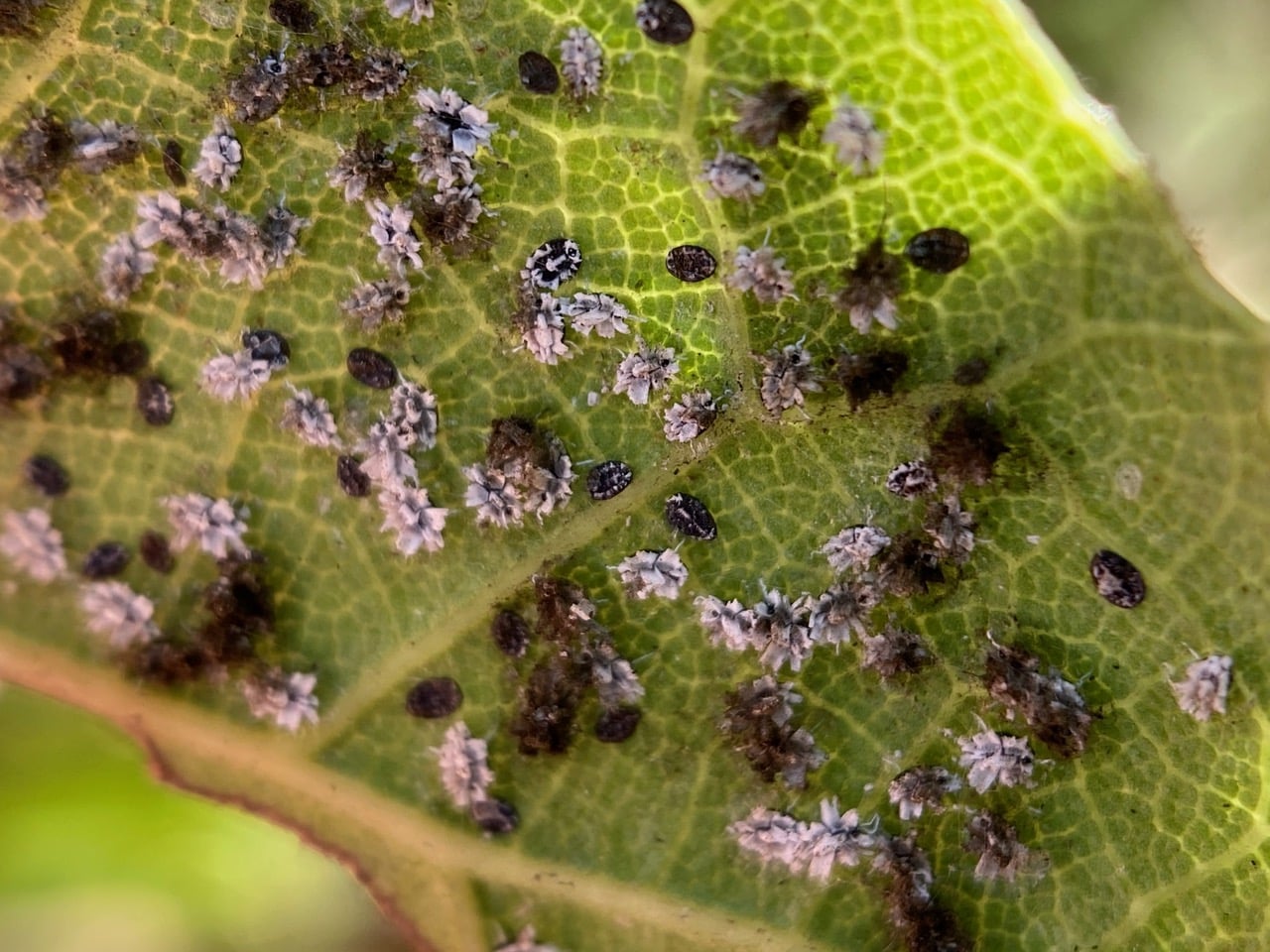I turn over another damaged leaf and find more of the same insects, some of them black.