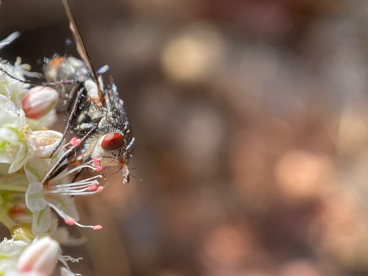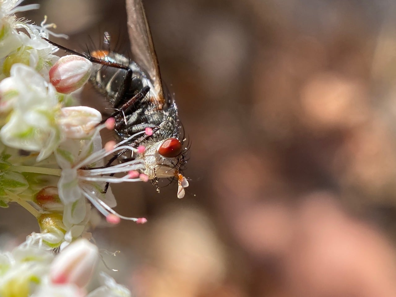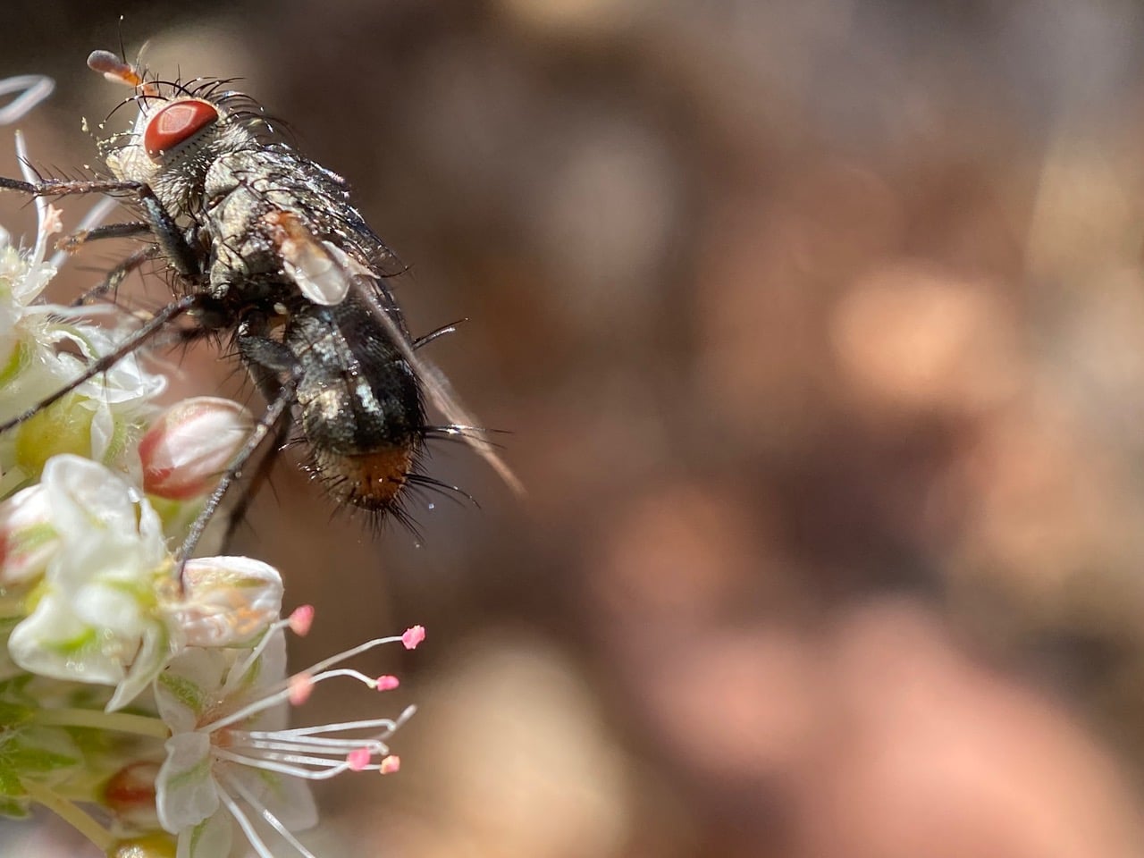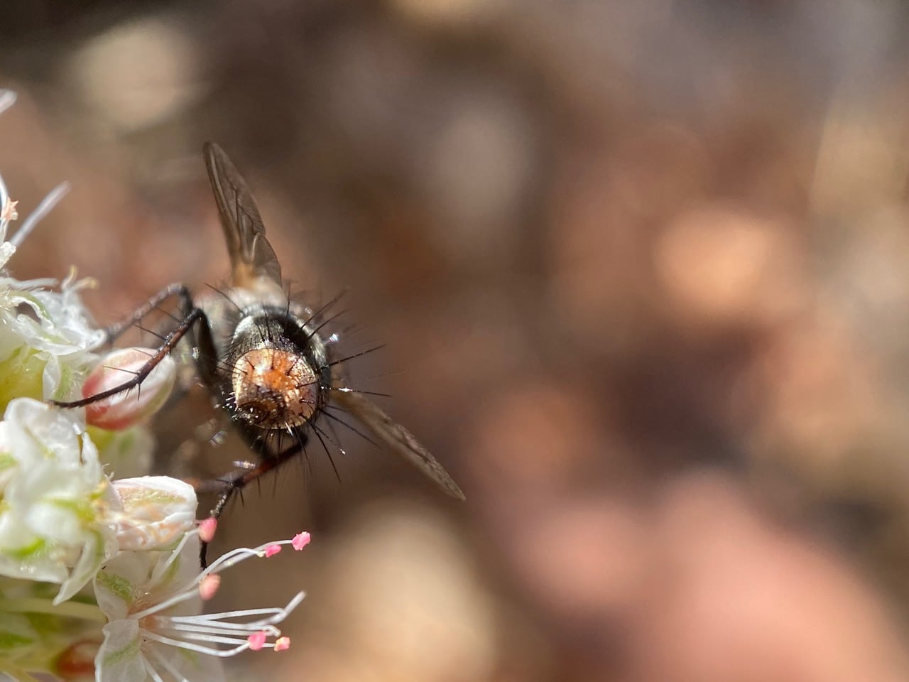 A Bristle Fly (family Tachinidae) lands on a rock next to the buckwheat.