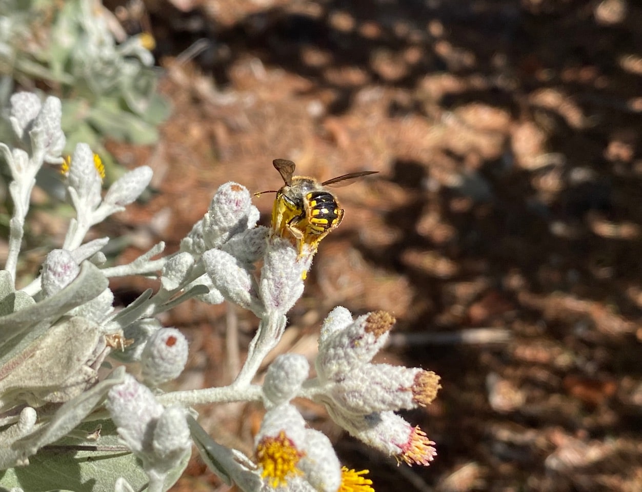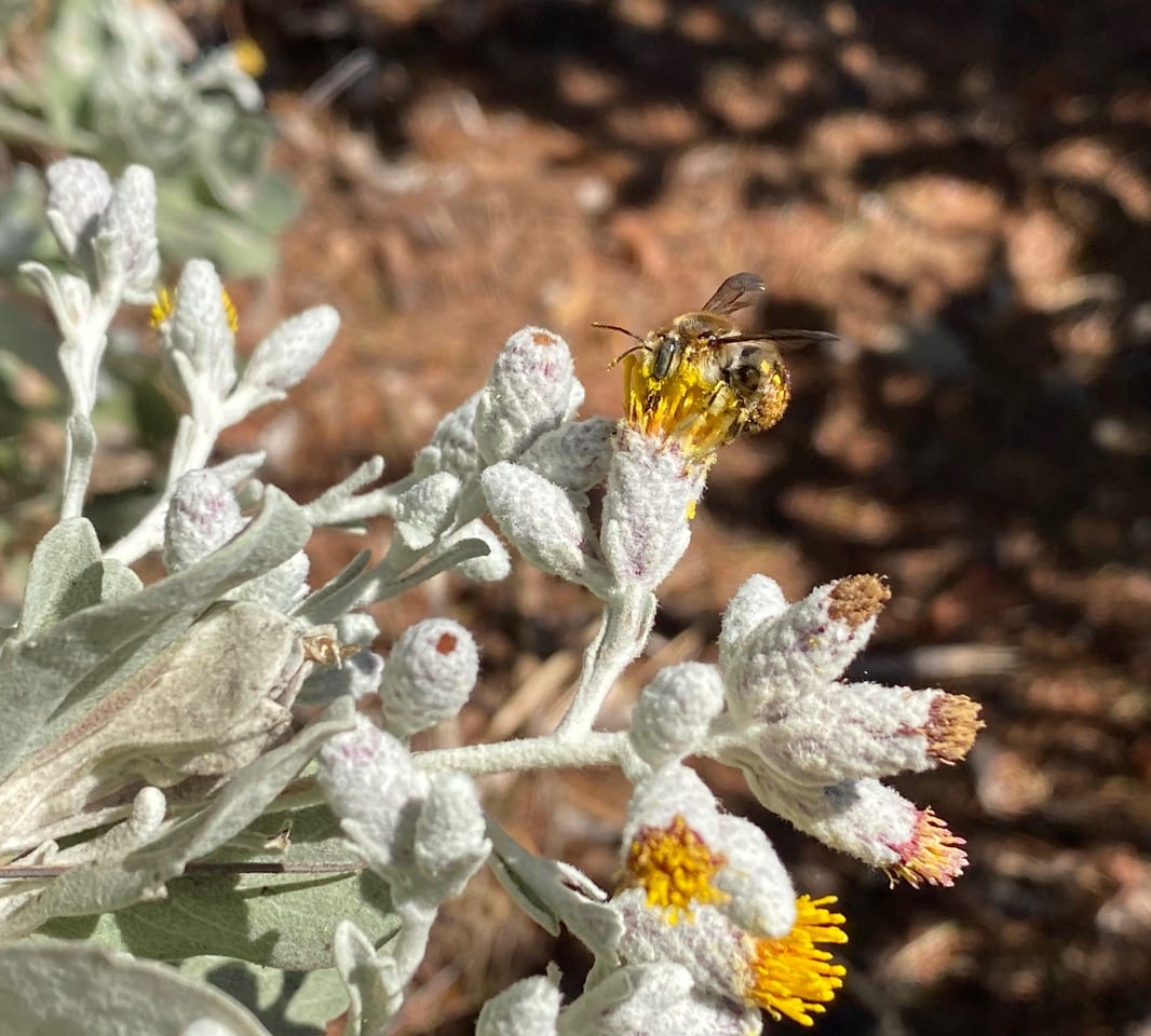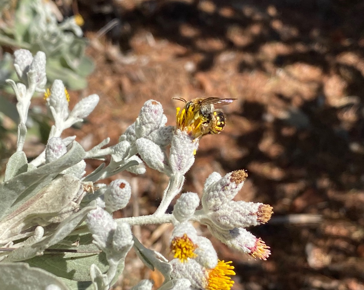 We stop by the garden of another Mendocino Park volunteer, Dave, kitty-corner from Anita’s. The Hazardia in the front garden is still blooming beautifully. A large European Woolcarder Bee, Anthidium manicatum (family Megachilidae) has landed on the a small flowerhead with barely enough standing room for the bee. I am intrigued – most Anthidium are known to visit flowers with bilateral symmetry, such as those of the pea and mint families. I don’t remember seeing one on an Asteraceae flowerhead.