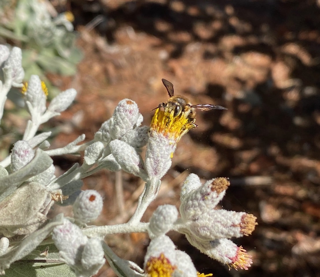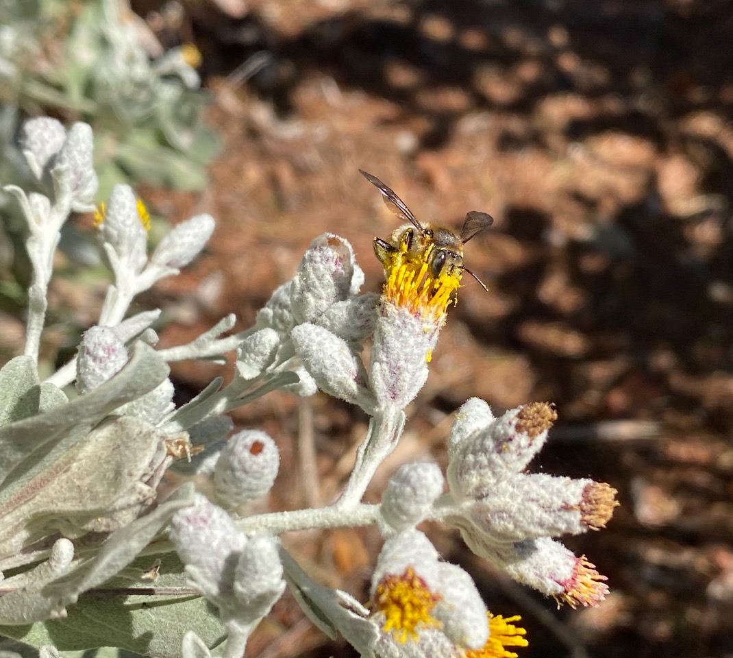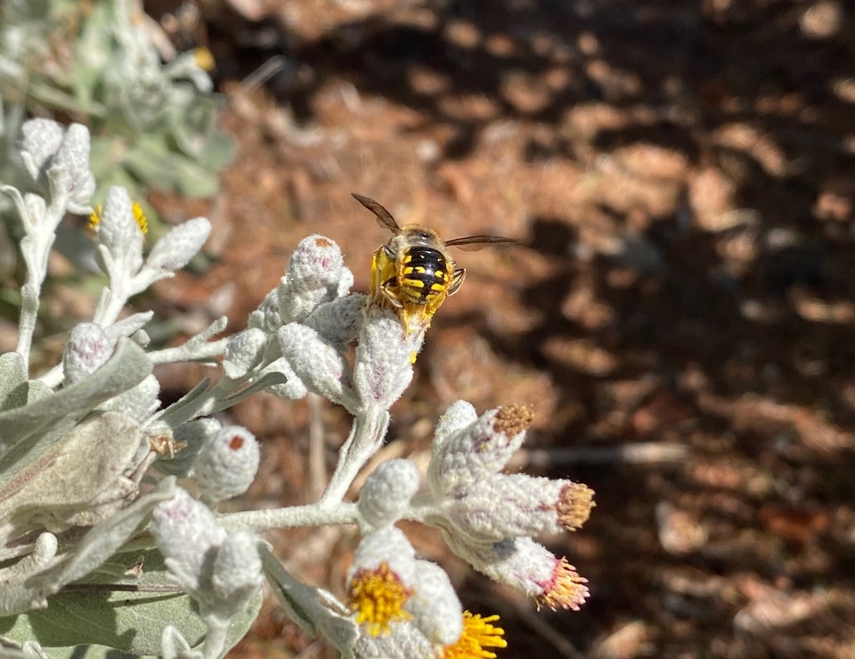 We stop by the garden of another Mendocino Park volunteer, Dave, kitty-corner from Anita’s. The Hazardia in the front garden is still blooming beautifully. A large European Woolcarder Bee, Anthidium manicatum (family Megachilidae) has landed on the a small flowerhead with barely enough standing room for the bee. I am intrigued – most Anthidium are known to visit flowers with bilateral symmetry, such as those of the pea and mint families. I don’t remember seeing one on an Asteraceae flowerhead.