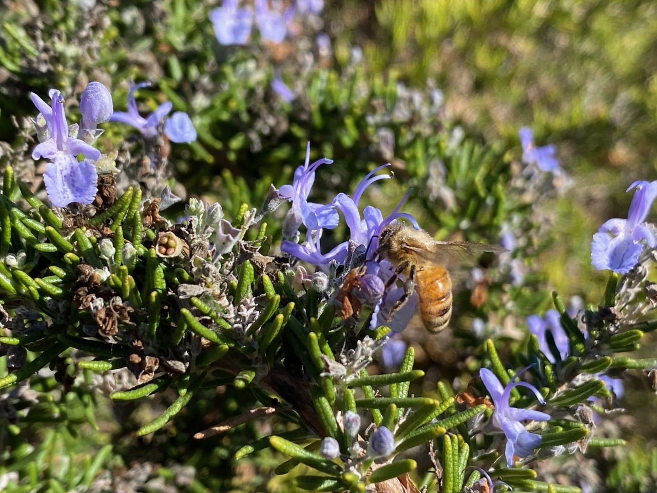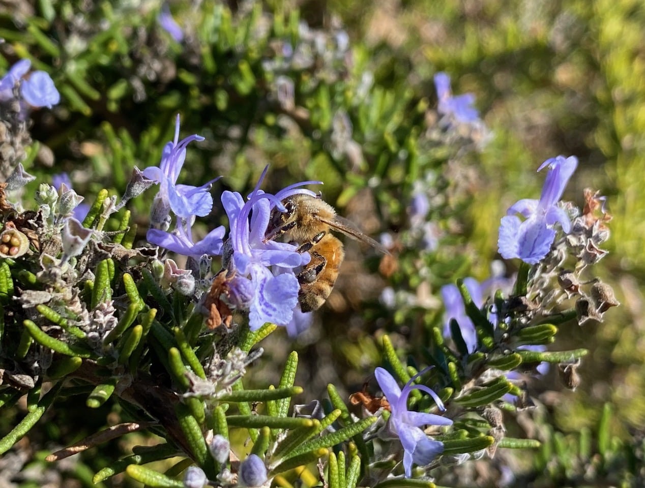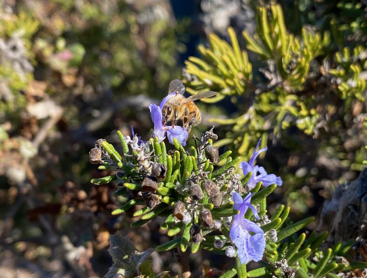 It is fun to watch pollination in progress as the Honey Bee goes from one Rosemary flower to the next – flower and bee working harmoniously in an orchestrated dance. Invariably the bee gets dabbed on her hairy thorax with pollen from the arching stamens. The size of the bee seems a perfect fit for the job. It is hardly surprising, as both flower and bee originate from Europe where they have co-evolved with each other.